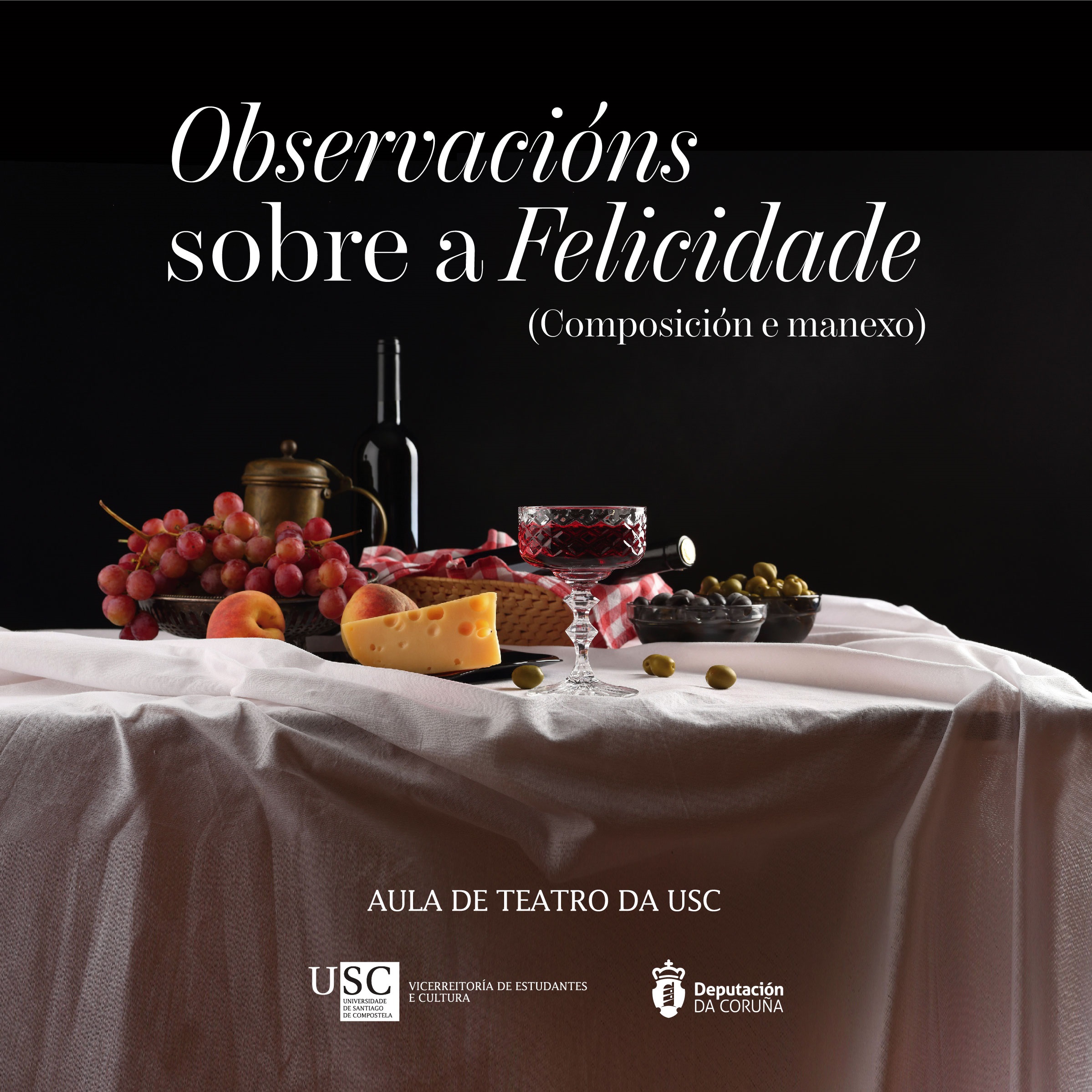 “Estamos afeitos a falar de tristura e tamén senta ben falar de felicidade”. Así define o director da Aula de Teatro da USC, Roberto Salgueiro, a vontade que se agocha detrás da última montaxe da compañía e que leva por título Observacións sobre a Felicidade (Composición e manexo). Trátase dunha serie de textos tecidos de tal modo que a súa posta en escena sirva para matinar sobre “como entender a felicidade, como reflexionar sobre ela ou como usala”, de aí que o nome da obra leve consigo os conceptos ‘composición’ e ‘manexo’. Con textos de Aira Portos, Laura López e do propio Roberto Salgueiro, a obra estréase o vindeiro xoves, 15 de decembro, no Salón Teatro de Compostela, ás 21.00 horas.
