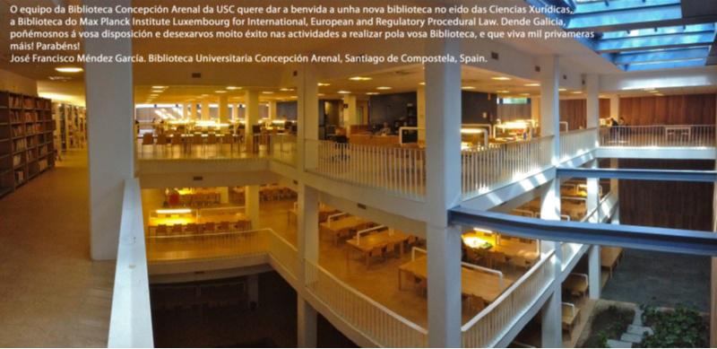 A Biblioteca Concepción Arenal da USC é unha das seis bibliotecas españolas presentes nunha mostra fotográfica internacional organizada con motivo da posta en marcha do Max Planck Institute Luxembourg for International, European and Regulatory Procedural Law. O centro compostelá comparte cartel xunto coas bibliotecas do Senado, a da Facultade de Dereito da Autónoma e a da Complutense de Madrid, a Francisco de Vitoria salmantina ou a da Facultade de Derecho da Universidade de Murcia. Na mostra, preséntanse bibliotecas xurídicas de Alemaña, Australia, Austria, Canada, Chile, China, Francia, Italia, Xapón, Luxemburgo, Países Baixos, Portugal, Reino Unido, Unión Europea e Estados Unidos. A maioría dos centros bibliotecarios acompañaron as fotos cun saúdo a modo de benvida ao novo centro bibliotecario emprazado en Luxemburgo. Neste senso, e como sinalou o director da Concepción Arenal, Francisco Méndez, “foi unha honra para a Concepción Arenal acompañar a bibliotecas de gran prestixio e sentirse acollido na familia de bibliotecas de Dereito”. Neste senso, agradeceu a deferencia da invitación do Max Planck Institute para participar nesta iniciativa.