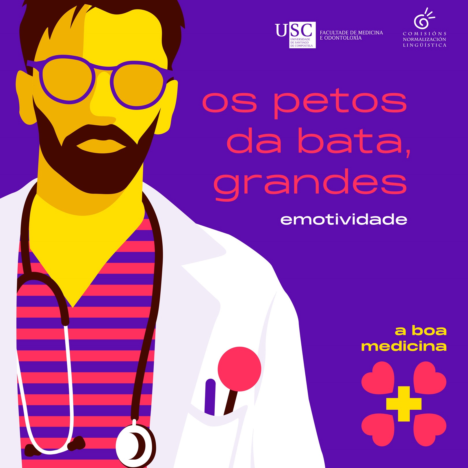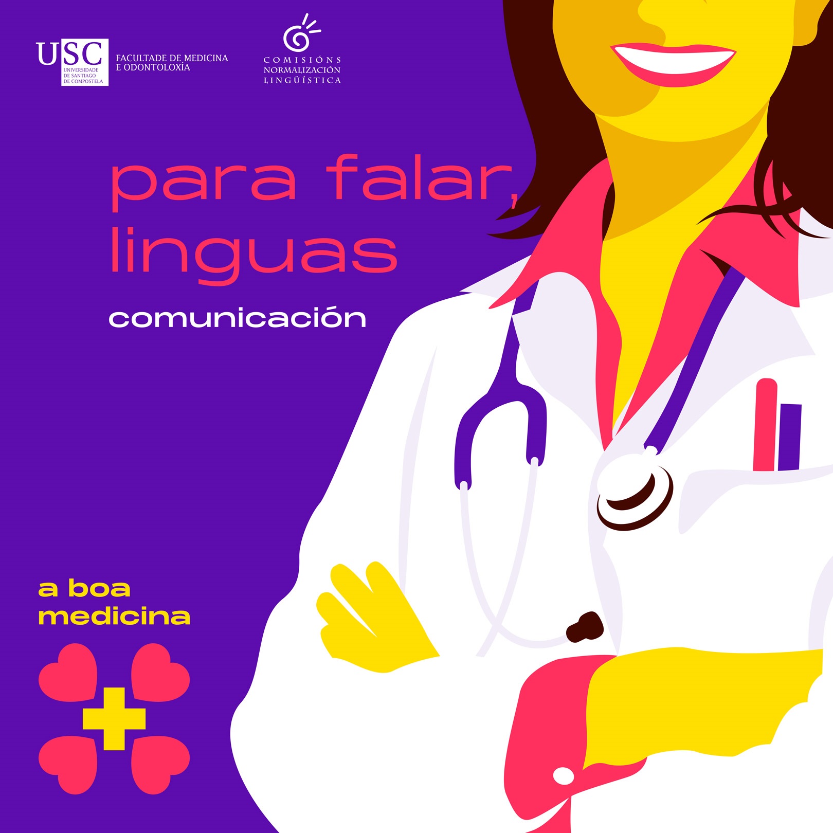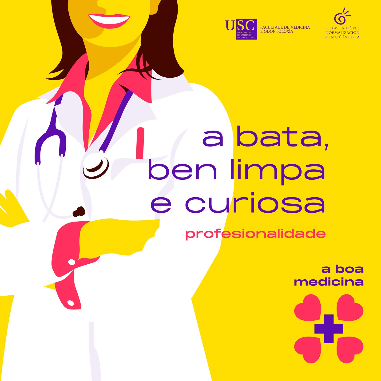 ‘A boa medicina’  conforma unha campaña propagandística de sensibilización. Consta de roll-ups, imaxes para as redes sociais, folleto de sensibilización e con información sobre os dereitos lingüísticos na USC, así como cunha actividade participativa con materiais de agasallo. A campaña xira arredor de frases ligadas coa estratexia de relacionar o respecto lingüístico e o coñecemento e uso das linguas coa profesionalidade no exercicio da medicina. O material creado pode consultarse na web da campaña.