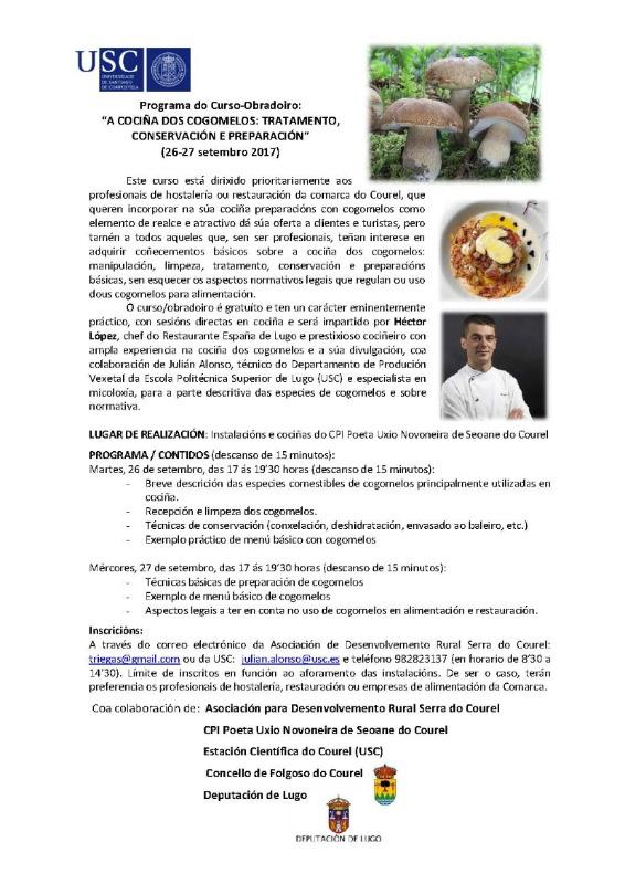 Este curso, cuxas sesións teóricas e prácticas se desenvolverán en quenda de tarde, de 17.00 a 19.30 horas, nas instalacións do CPI Poeta Uxío Novoneyra de Seoane do Courel, está orientado principalmente aos profesionais da hostalaría ou restauración na comarca courelá interesados en introducir ou incorporar na súa cociña preparacións con cogomelos.