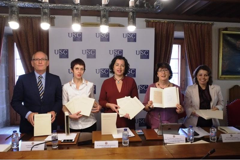 As profesoras Margarita Santos Zas, da USC, e Bénédicte Vauthier, da Universidade de Berna, presentaron este xoves en San Xerome o o volume 10 da Biblioteca da Cátedra Valle-Inclán Ramón del Valle-Inclán: Un día de guerra (Visión Estelar). La Media Noche. Visión estelar de un momento de guerra do que son editoras e para o que a USC achega todo o fondo documental e bibliográfico. No acto participaron tamén a vicerreitora de Internacionalización, Almudena Hospido; a directora da Biblioteca Universitaria da USC, Isabel Casal Reyes, e o director de Publicacións da USC, Juan L. Blanco Valdés.