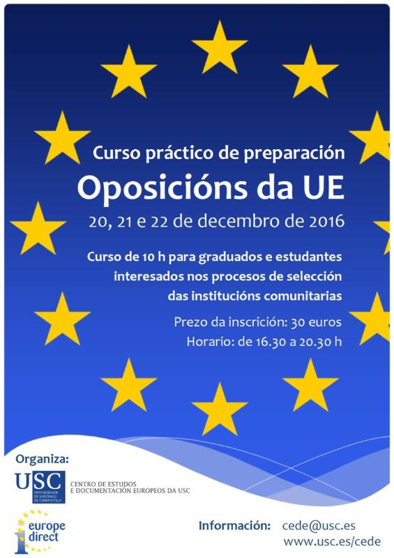 O Centro de Estudos e Documentación Europeos da USC (CEDE) organiza a vindeira semana un curso práctico de preparación para as oposicións da Unión Europea no que ademais de dar a coñecer as diferentes posibilidades de procesos de selección se ofrecerán as ferramentas necesarias para unha óptima preparación e integración das competencias psicolóxicas avaliadas.