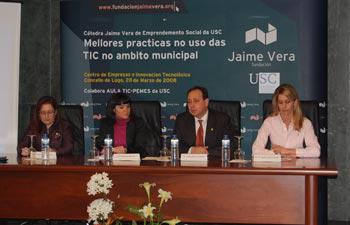 O vicerreitor estivo acompañado na inauguración pola directora da cátedra Jaime Vera de Emprendimento Social, Elena Vázquez Cendón; a directora da aula TIC-Pemes da USC, María Ángeles López Cabarcos, e a responsable de avaliación e calidade da Fundación Jaime Vera, Nuria Lera. A directora da cátedra explicou que as xornadas tiveron unha importante acollida por parte do Concello e serven como “un mecanismo para pór en valor a transferencia do coñecemento á sociedade”. Os catro defenderon a importancia de coordinar esforzos entre as institucións para levar adiante proxectos como o que se inaugurou hoxe.