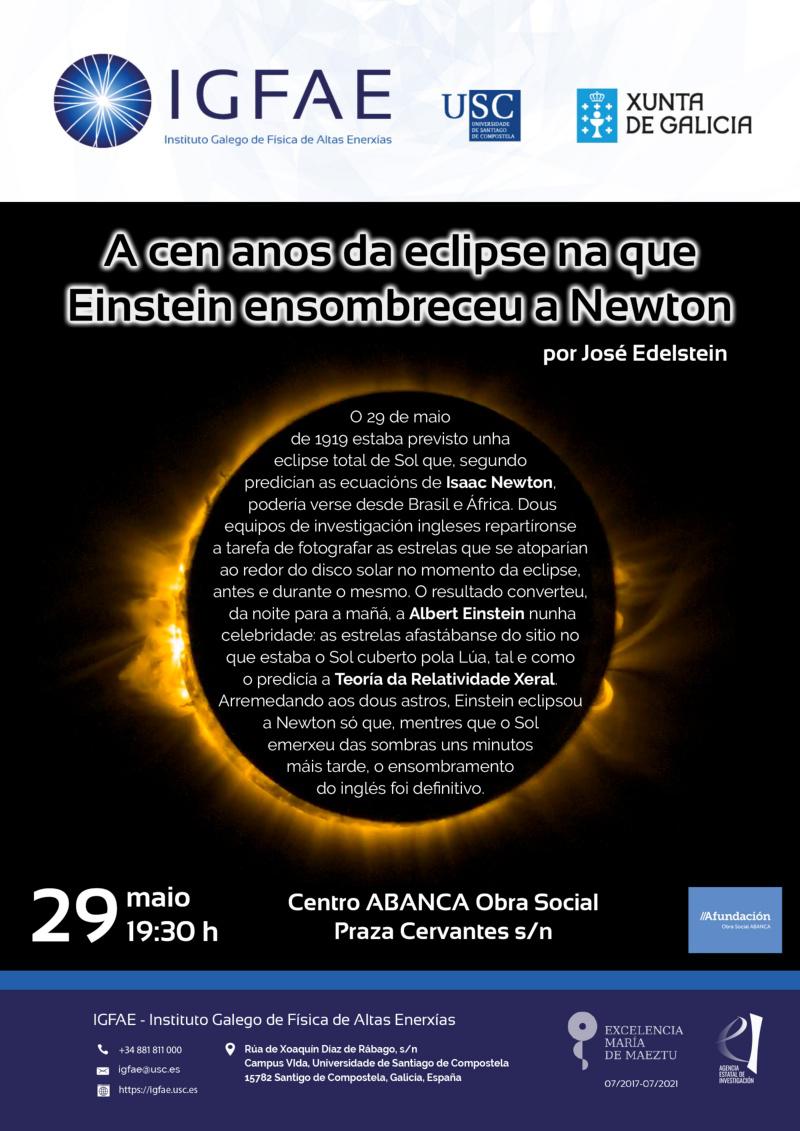 Nesta conferencia, José Edelstein relatará a historia de como Newton quedou eclipsado definitivamente por Einstein, quen se converteu na celebridade mundial que perdura xusto un século despois.