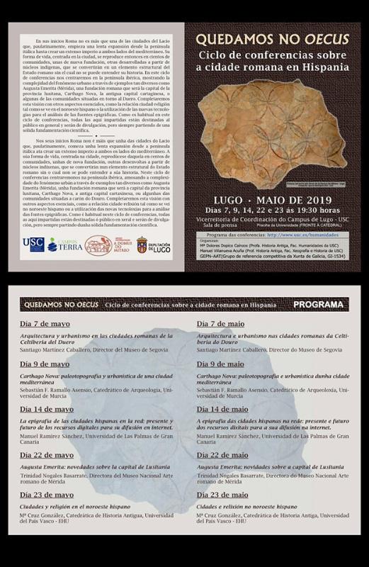 O ciclo de conferencias ‘Quedamos no oecus’, organizado polos profesores de Historia Antiga da USC Dolores Dopico e Manuel Villanueva, achégase ao estudo da complexidade do fenómeno urbano en Hispania a través de cinco relatorios, que se desenvolverán do 7 ao 23 de maio no auditorio da Casa do Saber de Lugo.