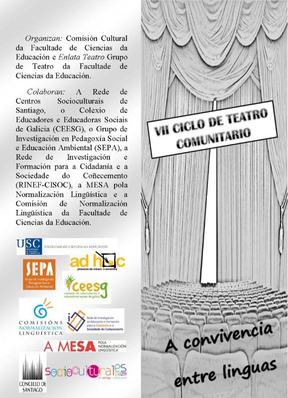 O Ciclo de Teatro Comunitario que organiza a Comisión Cultural da Facultade de Ciencias da Educación e Enlata Teatro inicia na súa sétima edición unha nova orientación para desenvolver o proxecto AD Hoc, cuxa finalidade será reunir a varias compañías de teatro afeccionado para a creación dunha peza por compañía participante. Aínda que cunha nova orientación, o ciclo mantén vixente a súa orientación cara alumnado, persoal da USC e cidadanía en xeral interesada no mundo teatral. A nova liña de acción aposta por unha apertura cara un teatro anovador, de creación, no que as agrupacións poidan establecer contacto con novos modos de facer e afrontar o proxecto. As compañías interesadas en participar deberán traballar no desenvolvemento dunha creación colectiva orixinal ideada e creada especificamente dentro do grupo de traballo, para unha duración escénica de 12 a 15 minutos e coa convivencia entre linguas como eixo temático, cuestión que será tratada libremente por cada compañía. Con esta proposta arredor da produción teatral, os promotores do ciclo buscan visualizar a convivencia entre linguas en Galicia a través da representación escénica así como xuntar a diferentes compañías creando un grupo que traballo que permaneza unido en prol da creación dunha estrutura teatral común na que se insire a peza de cada compañía. O desenvolvemento de Ad Hoc estará relacionado igualmente coa definición dun espazo de representación, debate e expresión aos diferentes grupos teatrais galegos no contexto universitario e coa creación de canles de comunicación entre os grupos de teatro da Universidade e os existentes en Galicia. O desenvolvemento do ciclo permitirá, ademais do intercambio de experiencias e a análise de propostas diversas, achegar a realidade teatral galega e universal ao estudantado universitario e presentala ante o colectivo universitario como unha actividade artística, de lecer e de formación. A mostra do proxecto Ad Hoc desenvolverase no Centro Sociocultural Santa Marta de Compostela os días 2, 3 e 4 de abril. Durante cada xornada o público, dentro dun réxime de aforo reducido, poderá asistir a tres pezas diferentes en espazos distintos da Centro Sociocultural. A entrada para cada peza será de balde e poderá retirarse non puntos que acorde a Rede Municipal de Centros Socioculturais do concello de Santiago así como na secretaría da Facultade de Ciencias da Educación, tanto en Campus Vida como no Campus Norte. No desenvolvemento do ciclo colaboran a Rede de Centros Socioculturais de Santiago, o Colexio de Educadores e Educadoras Sociais de Galicia (CEESG), o grupo de investigación en Pedagoxía Social e Educación Ambiental (SEPA), a Rede de Investigación e Formación para a Cidadanía e a Sociedade do Coñecemento (RINEF-CISOC), a MESA pola Normalización Lingüística e a Comisión de Normalización Lingüística da Facultade de Ciencias da Educación.