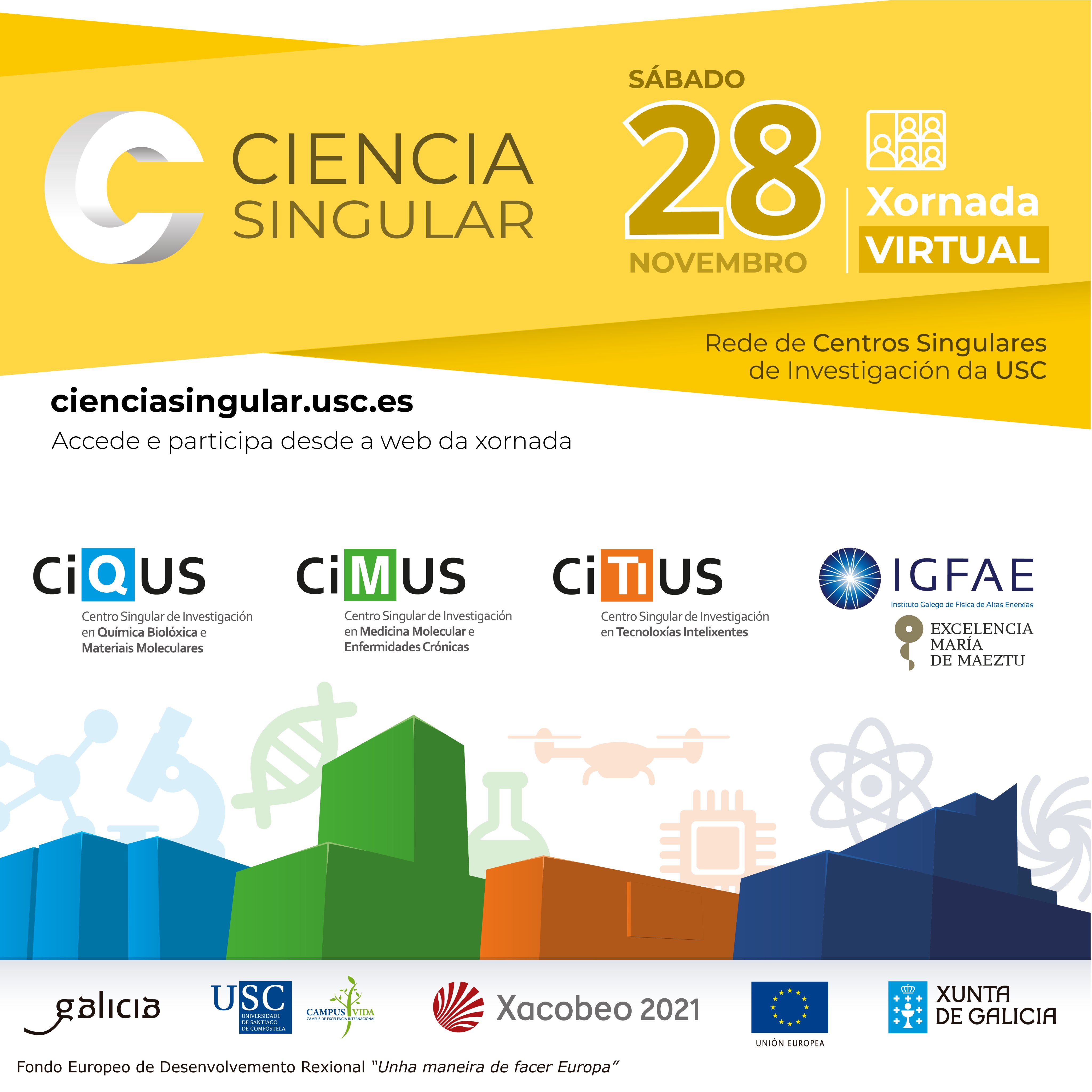 A Rede de Centros Singulares de Investigación (RCSI) da USC celebra este sábado 28 de novembro unha nova edición da xornada anual de divulgación ‘Ciencia Singular’, destinada a amosar á sociedade o labor de excelencia que realizan os catro centros que integran a Rede. A pandemia por mor da COVID-19 obrigou a reformular o formato habitual deste evento que chega xa á súa cuarta edición, a primeira delas que se desenvolverá en liña.