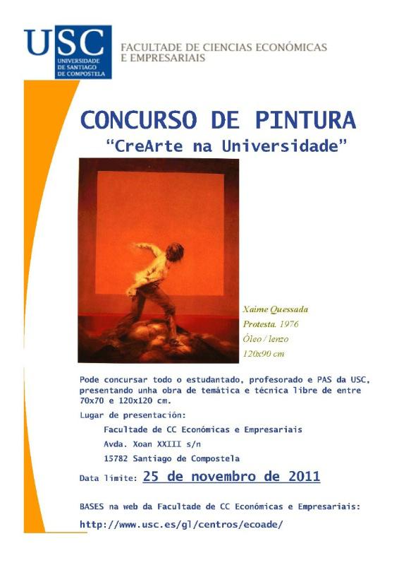 A Facultade de Ciencias Económicas e Empresariais convoca o I Concurso de Pintura ‘CreArte na Universidade’ no marco da Quincena Cultural do centro que este venres 18 chega ao seu fin cun concerto de música tradicional galega. No certame, cuxo prazo de presentación remata o 25 de novembro, pode participar toda a comunidade Universitaria da USC. As bases establecen que só se pode presentar unha obra por artista, de temática libre, que deberá ser inédita e non estar premiada noutro certame. A dimensión da obra non poderá ser inferior a 70x70 centímetros nin superior a 120x120. As obras seleccionadas expoñeranse temporalmente na Facultade nunha mostra que se inaugurará o mércores 14 de decembro ás 13.00 horas coincidindo coa entrega do premio, e permanecerá aberta ata o 10 de febreiro do vindeiro ano. De entre as seleccionadas, o xurado poderá outorgar un premio de 500 euros a unha das obras. Ademais, a premiada pasará a formar parte do patrimonio da Facultade e permanecerá durante un ano no ‘Espazo de Arte’ reservado no centro para este fin.