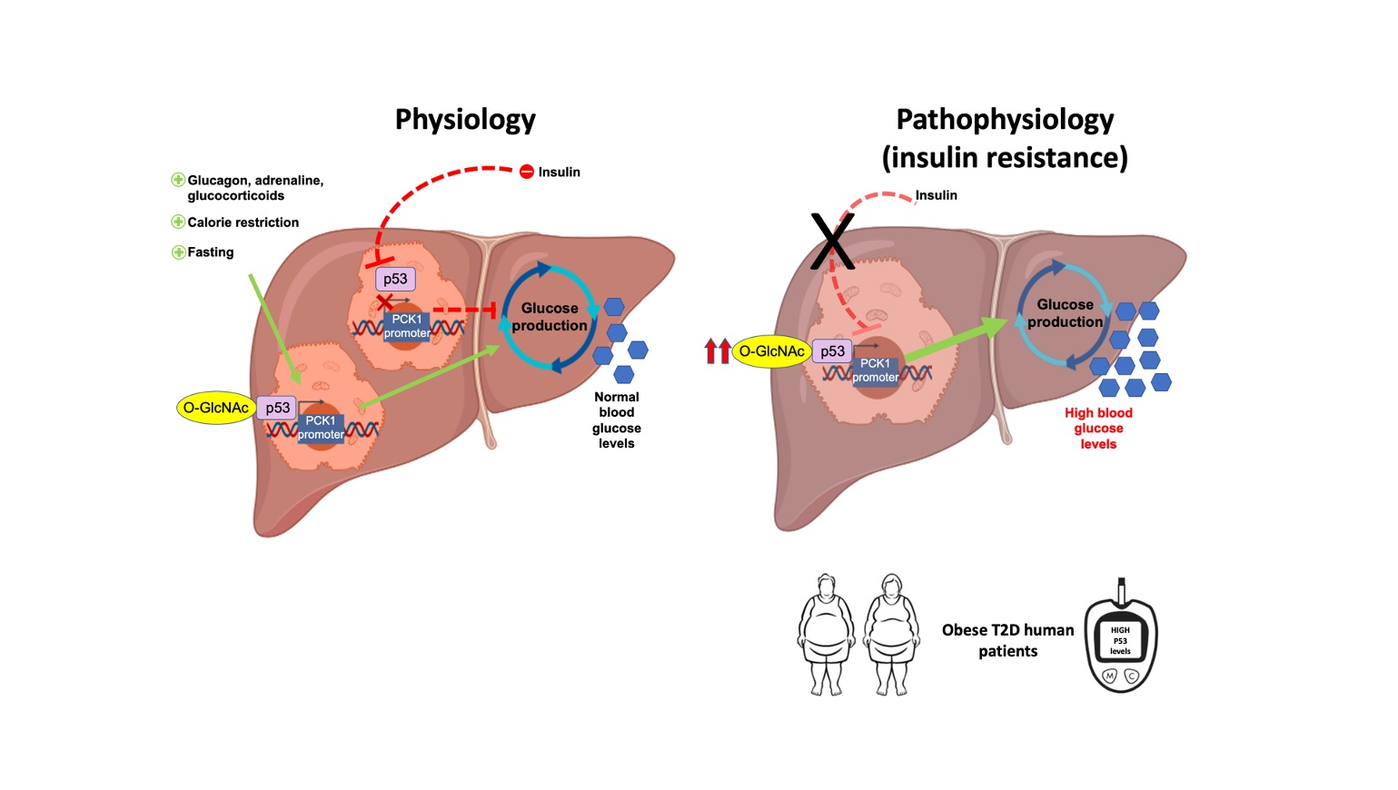 Ademais, nesta investigación descríbese como as principais hormonas que estimulan a produción de glicosa (glucagón, adrenalina e  cortisol), necesitan da O- GlcNAcilación de  p53 para poder inducir a produción de glicosa. “Pola contra, un incremento excesivo dos niveis de p53 O-GlcNAcilado impide que a sinalización da insulina actúe de forma apropiada no fígado, xerando resistencia á insulina”, aclara.