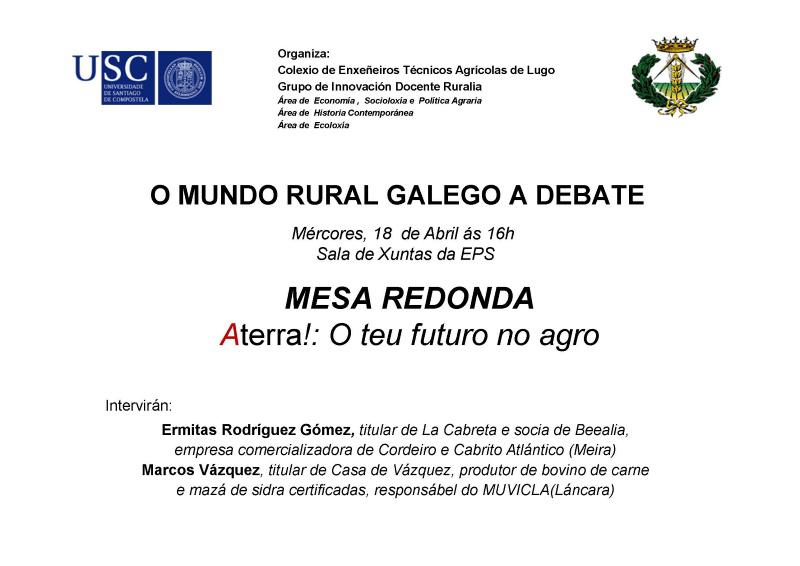 Un coloquio sobre as vantaxes e oportunidades que ofrece a incorporación á actividade agraria pecha este mércores, a partir das 16.00 horas, na sala de xuntas da Escola Politécnica Superior de Enxeñaría do Campus Terra da USC, o ciclo ‘Mundo rural a debate’, un foro que nesta ocasión se desenvolve baixo o lema ‘Aterra!: O teu futuro no agro’.