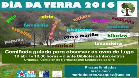 A Comisión de Normalización Lingüística da Escola Politécnica Superior (EPS) organiza o 19 de abril unha camiñada ornitolóxica guiada pola contorna do campus universitario de Lugo, durante a que as persoas participantes poderán visualizar e distinguir o amplo abano de especies que conforman o patrimonio ornitolóxico da contorna de Lugo. Esta actividade, de carácter gratuíto e organizada co gallo da celebración do Día da Terra, oferta un número de prazas limitadas. As persoas interesadas poden formalizar xa a súa inscrición a través do enderezo de correo electrónico mariadolores.vazquez [at] usc.es (mariadolores[dot]vazquez[at]usc[dot]es). A expedición de participantes nesta camiñada ornitolóxica guiada partirá ás 18.00 horas de diante da Biblioteca Intercentros do campus de Lugo. O percorrido deseñado levará aos viandantes polo campus e as ribeiras do Miño, un itinerario no que terán a ocasión de ver pombos, lavandeiras brancas, xílgaros, picapeixes, lavancos... e algúns outros veciños voadores.