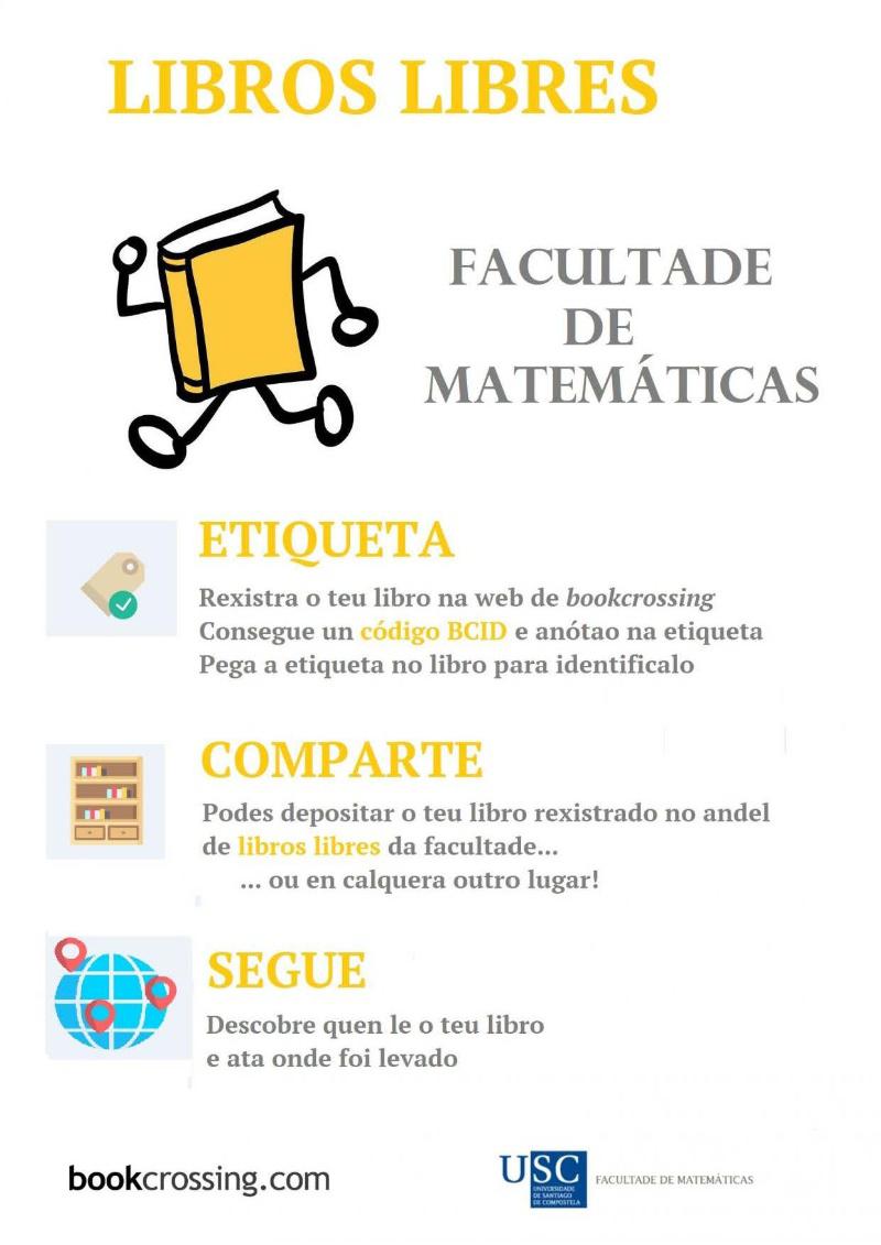 A Facultade de Matemáticas da USC súmase á iniciativa internacional BookCrossing baseada na idea de compartir libros e unir persoas. O punto de intercambio de libros no centro atópase a carón das máquinas expendedoras da planta soto; alí sitúase o Andel dos libros libres e as etiquetas identificadoras.