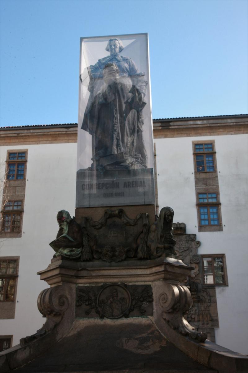 Nunha acción reivindicativa da Comisión de Igualdade da Facultade de Filosofía, e coa colaboración do Concello, a figura de Concepción Arenal presidirá todo este mes a Praza de Mazarelos. Trátase dunha instalación exterior temporal que cubre con paneis fotográficos a estatua de Montero Ríos.