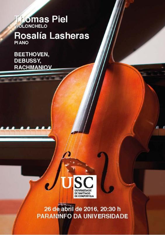 A pianista Rosalía Lasheras e o violonchelista Thomas Piel ofrecerán este martes 26 un concerto no Paraninfo da Universidade. A cita, de entrada libre, será ás 20.30 horas no Paraninfo da Universidade.