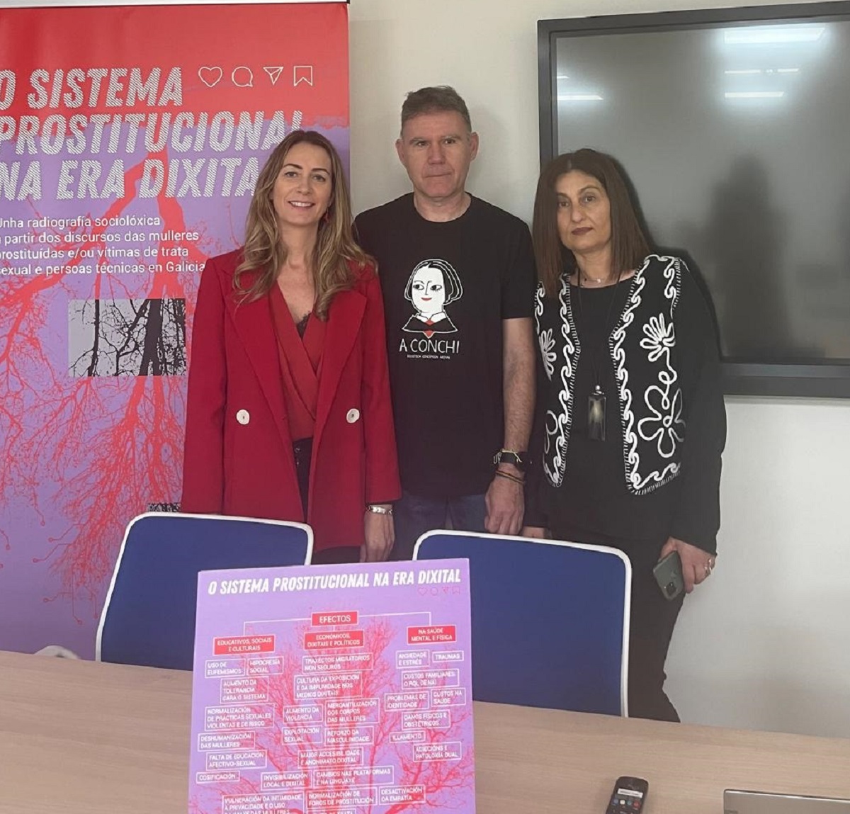 O persoal investigador e docente da USC Jorge García Marín, Lorena Añón Loureiro e Begoña Gómez Vázquez presentaron este venres en Ciencias da Educación o estudo ‘O sistema prostitucional na era dixital: radiografía sociolóxica a partir dos discursos das mulleres prostituídas e/ou vítimas de trata sexual e de persoas técnicas en Galicia’. Nel suxiren que, no momento dixital que vivimos, ese sistema intensificou a explotación e violencia contra as mulleres e reafirman “a importancia de accións políticas, lexislativas e educativas para reducir o impacto desta industria na sociedade”. “Internet tense convertido nun novo campo social para o sistema prostitucional”, aseguran.