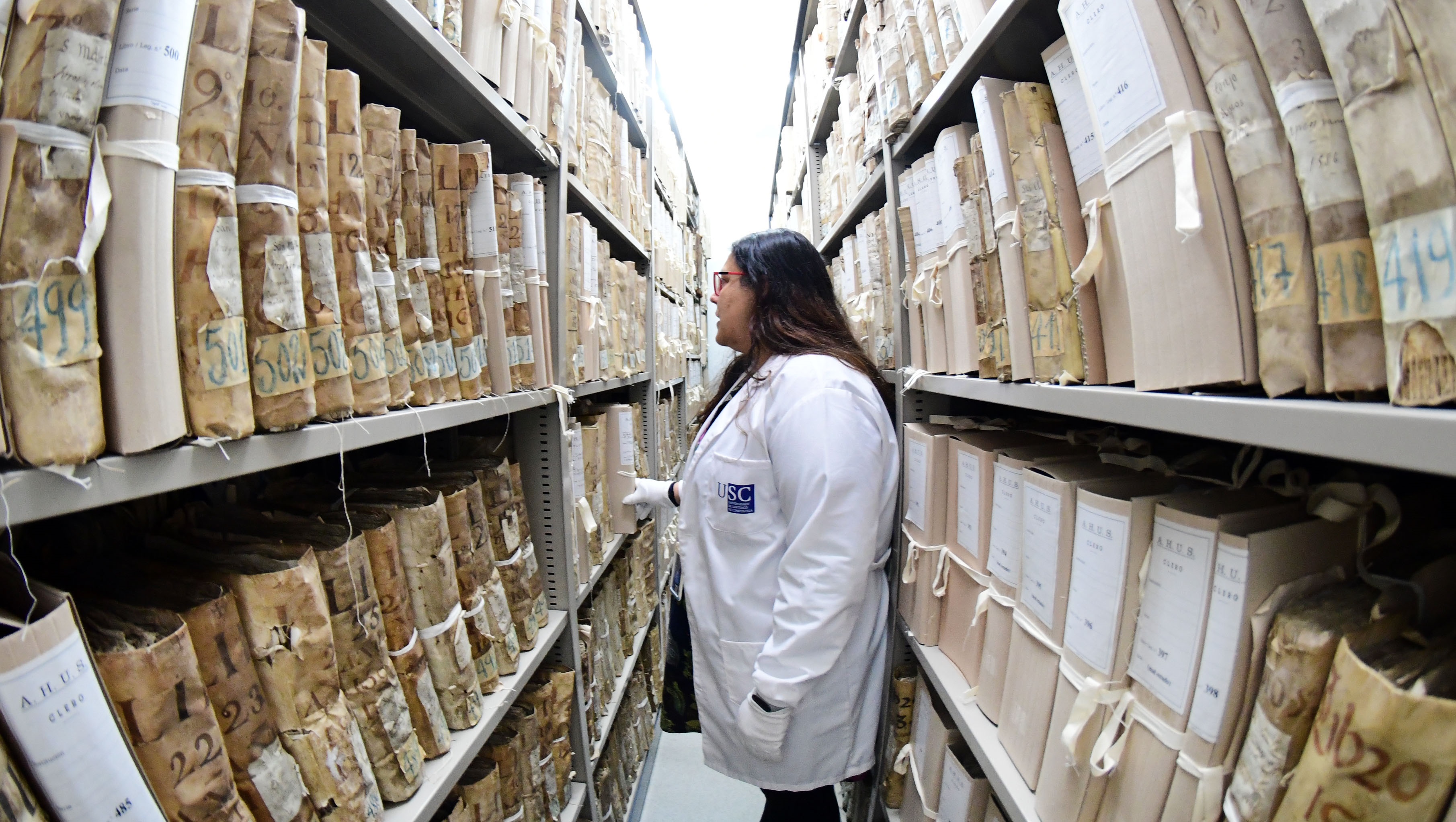 Unha traballadora no Arquivo Histórico Universitario. Foto: Santi Alvite