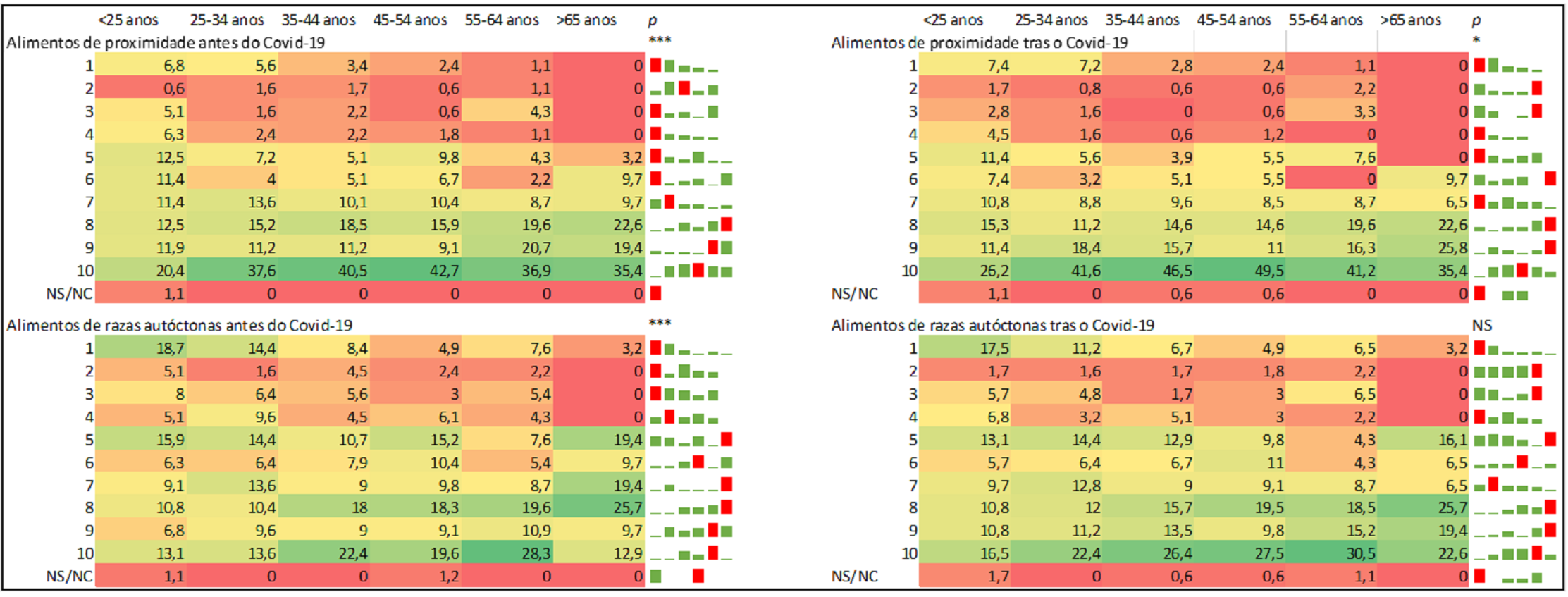 Unha análise polo miúdo das franxas de idade permite asemade observar que antes da COVID-19 existían maiores diferenzas para a maioría de parámetros estudados, dado que as persoas de mediana idade acostumaban estar máis preocupadas por estas cuestións. Trala pandemia do coronavirus, esas diferenzas dilúense ou incluso desaparecen por completo e todo apunta a que o comportamento social responde ao dun grupo máis homoxéneo en canto á preocupación polos aspectos alimentarios.