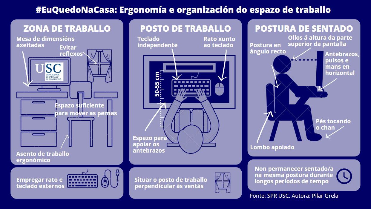 O Servizo de Prevención de Riscos Laborais da USC acaba de facer públicas unha serie de pautas sobre como debe ser a disposición física do espazo laboral no contexto actual de teletraballo por mor da crise do COVID-19 e o estado de alarma. O emprego dunha mesa con dimensións adecuadas para a actividade que se debe realizar é a primeira das recomendacións. Asemade, tamén é preciso usar un asento de traballo ergonómico e, en todo caso, que permita unha correcta postura de sentado.