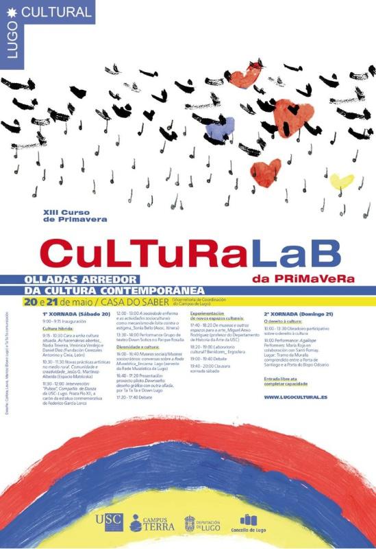 As culturas híbridas, os novos espazos de experimentación e creación, a diversidade cultural e o dereito á cultura centrarán esta fin de semana temática das distintas sesións programadas no marco do CulturaLab de Primavera da USC, un programa que se desenvolverá os días 20 e 21 de maio na Casa do Saber de Lugo baixo o título ‘Olladas arredor da cultura contemporánea’ e que nesta edición mestura o tradicional formato dos seminarios de análise e debate xurdidos na década de 1960 no Instituto Masculino (IES Lucus Augusti) de Lugo, cos foros abertos do CulturaLab do Campus Terra.