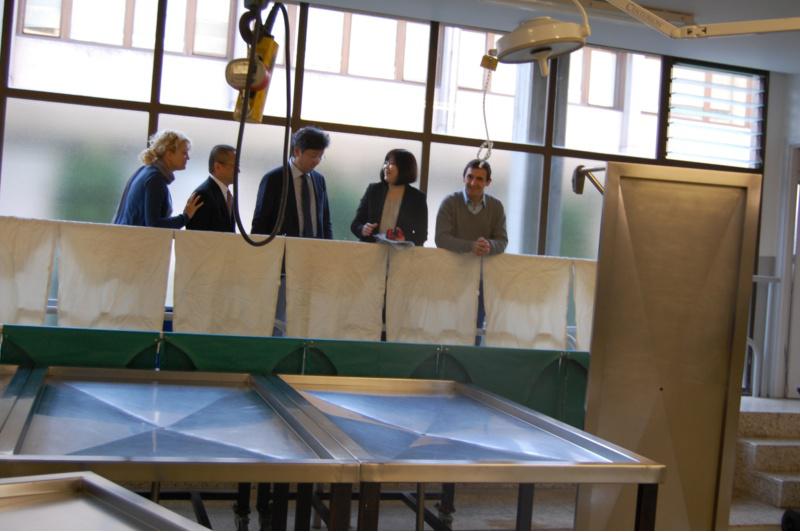A visita ao campus de Lugo desta comitiva xaponesa responde a unha recomendación da Asociación Europea de Centros de Formación Veterinaria (EAEVE) e encádrase no marco do proceso de reestruturación dos estudos de Veterinaria impulsado en Xapón, cuxo goberno pretende reorganizar en cinco as dez facultades públicas de Veterinaria existentes, a través da cooperación e a redistribución do estudantado. O número total de facultades de Veterinaria en Xapón é de 16, xa que a estes centros públicos cómpre sumar outras 6 facultades privadas. A implicación da EAEVE neste proceso responde á súa elección como organismo internacional ao que se encomendou a acreditación da calidade dos novos programas de formación veterinaria resultantes deste proceso de fusión e reorganización dos centros públicos de ensinanza Veterinaria. Acompañados da presidenta da EAEVE, a profesora da USC na Facultade de Veterinaria do campus de Lugo, Ana María Bravo del Moral, os responsables universitarios de Xapón visitaron na mañá do luns as distintas dependencias de docencia e investigación do citado centro universitario lugués, un percorrido no que tamén participou o decano Germán Santamarina, así como outros profesores do centro. Unha vez completada esta primeira visita ás instalacións da Facultade de Veterinaria, a comitiva nipona mantivo unha reunión co vicerreitor de Desenvolvemento Científico e Tecnolóxico do campus de Lugo, Andrés Barreiro, quen os guiou polos distintos servizos e laboratorios de investigación do campus lugués centralizados no edificio Cactus. A recepción institucional na Vicerreitoría de Coordinación de Lugo, un acto ao que se sumou o vicerreitor Javier Bueno Lema, serviu para cerrar a programación matinal desta delegación universitaria xaponesa, que, xa en quenda de tarde, mantivo diversas reunións de traballo con profesores e investigadores da Facultade de Veterinaria. Os responsables das universidades de Obihiro e Hokkaido, os dous centros xaponeses no que se está a aplicar de forma experimentar este proceso de reestruturación das ensinanzas universitarias veterinarias no país oriental, pecharán este martes a súa estadía no campus de Lugo coa visita ao Hospital Universtiario Veterinario Rof Codina, onde tamén poderán coñecer o proxecto do Cebiovet, cuxas obras aínda están en marcha. Os profesores Hisao Kurazono, Keiko Kawamoto e Mutsumi Inaba desprazaranse o mércores a Santiago de Compostela, onde está previsto que manteñan cadansúa reunión co reitor da USC, Juan Viaño, e coa vicerreitora de Internacionalización, Almudena Hospido. Este nova xornada de traballo servirá de colofón á estadía europea promovida pola EAEVE que están a realizar este mes de setembro os profesores destas dúas universidades xaponesas, que chegan ao campus de Lugo da USC logo de ter visitado a Facultade de Veterinaria de Lieja (Bruxelas). Bravo e Santamarina, cos delegados universitarios xaponeses, na sala de necropsias de Veterinaria
