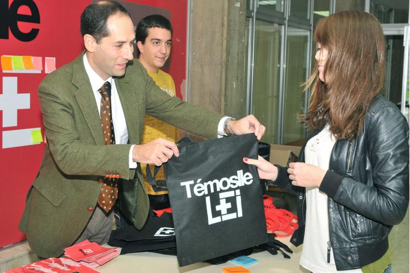 30 de cada 100 horas de docencia en galego. Esta é a meta que a Facultade de Dereito da USC tentará alcanzar ao longo dos próximos tres cursos académicos a través da campaña ‘Témoslle Lei’, triplicando as actuais cifras de uso do galego, que o pasado curso se situaban no 11,88% das horas de docencia. Unha iniciativa que acaba de poñerse en marcha dirixida ao alumnado deste centro compostelán co obxecto de sensibilizalo a respecto da utilización da lingua galega no propio centro e no mundo profesional. Dise da acción de gardar fidelidade, sentir simpatía ou terlle un grande aprezo, o lema elixido ‘Témoslle Lei’ incide no feito de que o galego conta con lexislación que o protexe e fomenta ata lograr a igualdade real das dúas linguas cooficiais en todos os ámbitos e, asemade, na cuestión afectiva e identitaria cara a esta lingua. Durante tres días, en quendas de mañá e tarde, alumnos de Dereito de diversas asociacións estudantís repartirán entre o estudantado do centro o material da campaña: unha bolsa co lema ‘ Témoslle Lei’, dous folletos con argumentario e un cd-rom coa escolma, en galego, das leis máis importantes que se estudan durante a carreira, así como recursos lingüísticos dos que podan botar man á hora de utilizaren o galego na súa vida académica. A posta en escena da campaña realizouse por sorpresa este luns na Facultade de Dereito, onde ademais do reparto de material, os universitarios tiñan á súa disposición un vídeo no que diversos profesionais do mundo do Dereito opinan sobre o uso da lingua neste ámbito. O fiscal xeral de Galicia, Carlos Varela; a maxistrada do Social en Santiago, Paz Filgueira; o xuíz da Fonsagrada, Luis Villares; o decano do Colexio de Avogados de Santiago, Evaristo Nogueira; o secretario do Concello de Outes, Xaquín Monteagudo; e os profesores da Facultade de Dereito José Antonio Gómez Segade e Antonia Nieto Alonso participan neste vídeo e animan ao PDI e ao alumnado do centro a incorporar a lingua galega no seu quefacer profesional.