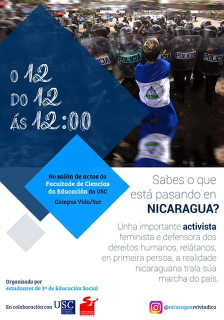 Para coñecer en profundidade a situación actual do país, está prevista para este mércores 12 ás 12.00 horas no Salón de actos da Facultade de Ciencias da Educación (Campus Vida) un encontro cunha recoñecida activista e feminista nicaraguana cunha grande traxectoria na defensa dos dereitos humanos. O seu labor remóntase a tres décadas de traballo no campo da xustiza social, a defensa do pobo nicaraguano e a reivindicación do papel da muller.