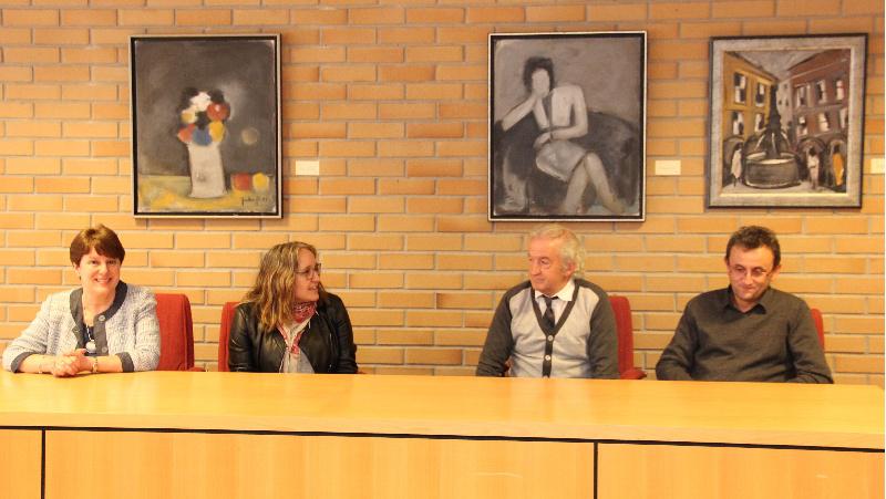 A vicerreitora de Servizos Universitarios do campus de Lugo, Carme Silva, e a decana da Facultade de Humanidades, María Isabel González Rey, e Gonzalo Fernández, tamén profesor da USC e principal responsable de que Díaz Gesto amose a súa obra en Humanidades, arrouparon a Díaz Gesto na sesión de apertura da exposición da súa obra. A mostra ‘Olladas de Lugo’, que permanecerá aberta ata o vindeiro 20 de maio no salón de graos da Facultade de Humanidades de Lugo, estará aberta ao público en quenda de mañá, de 11.00 a 14.00 horas.