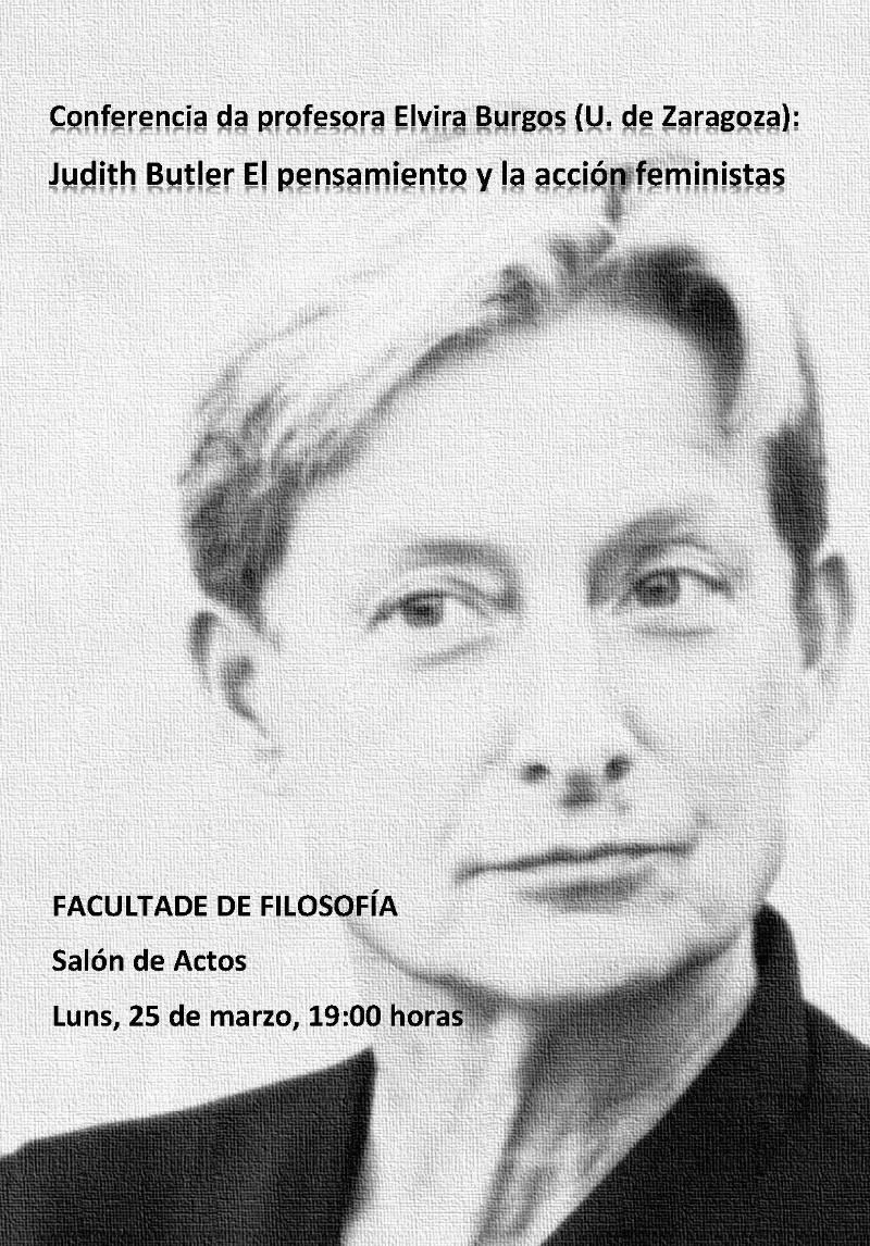 A profesora de Filosofía da Universidade de Zaragoza Elvira Burgos ofrece o luns 25 na USC a conferencia 'Judith Butler. O pensamento e a acción feministas'. Organizado pola profesora da Facultade de Filosofía María Xose Agra, o relatorio terá lugar ás 19:00 horas no Salón de Actos do centro.