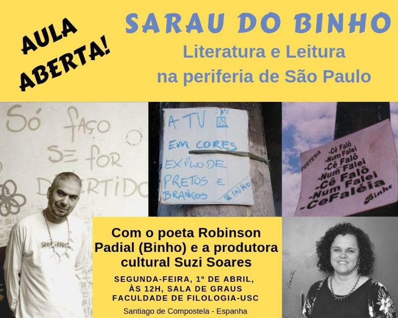 Aula Aberta Sarau do Binho O poeta Robinson Padial, criador do Sarau do Binho, e a produtora Suzi Soares falarán no mesmo espazo o 1 de abril ás 12.00 horas sobre a súa experiencia como artelladores culturais e estratexias de mediación e incentivo á lectura na zona sur de São Paulo. Ademais, Padial presentará parte da súa produción poética en diversos estilos e soportes, moitos deles manifestados en intervencións urbanas como o proxecto Postesia no que penduraba poemas na iluminación urbana.