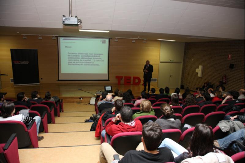 O reitor Juan Casares abriu na Facultade de Psicoloxía a quenda de intervencións do encontro TEDxGalicia co relatorio ‘A solución pasa pola Universidade’. Baixo o lema ‘Ideas que paga a pena compartir’, esta é a primeira edición dun encontro en formato TED no ámbito universitario galego, articulado sobre charlas curtas, de ata 15 minutos como máximo, cada unha delas precedida por unha breve presentación e a inclusión de material audiovisual Organizado pola Cátedra Bancaja para Mocidade Emprendedora en colaboración coa Vicerreitoría de Estudantes, Cultura e Formación Continua, o encontro contou coa participación ademais das profesoras Elena Vázquez e Josefina Ling, así como de Jorge Cubela, o alcalde máis novo de España e estudante de Dereito; ou José Luís Abadín, piloto do FIA Formula Two Championship e estudante de Administración e Dirección de Empresas, así como estudantes e investigadores de diversas áreas que ofreceron as súas experiencias nos seus respectivos ámbitos de traballo. O encontro deste venres representa a segunda edición do encontro TEDxGalicia nesta ocasión coa vontade de achegar a Universidade á realidade social e da empresa a través dun espazo no que compartir coñecemento interdisciplinar. Os principais destinatarios deste foro son o estudantado e demais membros da comunidade universitaria aos que se lle ofrece este novo entorno que aposta polas ideas e o coñecemento transmitido dun xeito diferente, entretido pero sen perder o seu rigor, sinalan os seus promotores. O relatores dun encontro TED comparten a súa experiencia, visión do mundo e ideas que poden iniciar un cambio dende o momento que son compartidas. Así, en TEDxGalicia@USC combinase o visionado de vídeos coas distintas intervencións dos participantes entre os que se atoparán estudantes, investigadores/as e docentes da USC. A finalidade será a presentación de ideas novas nun contorno que propicie a comunicación. Máis información en: http://usc.tedxgalicia.com/