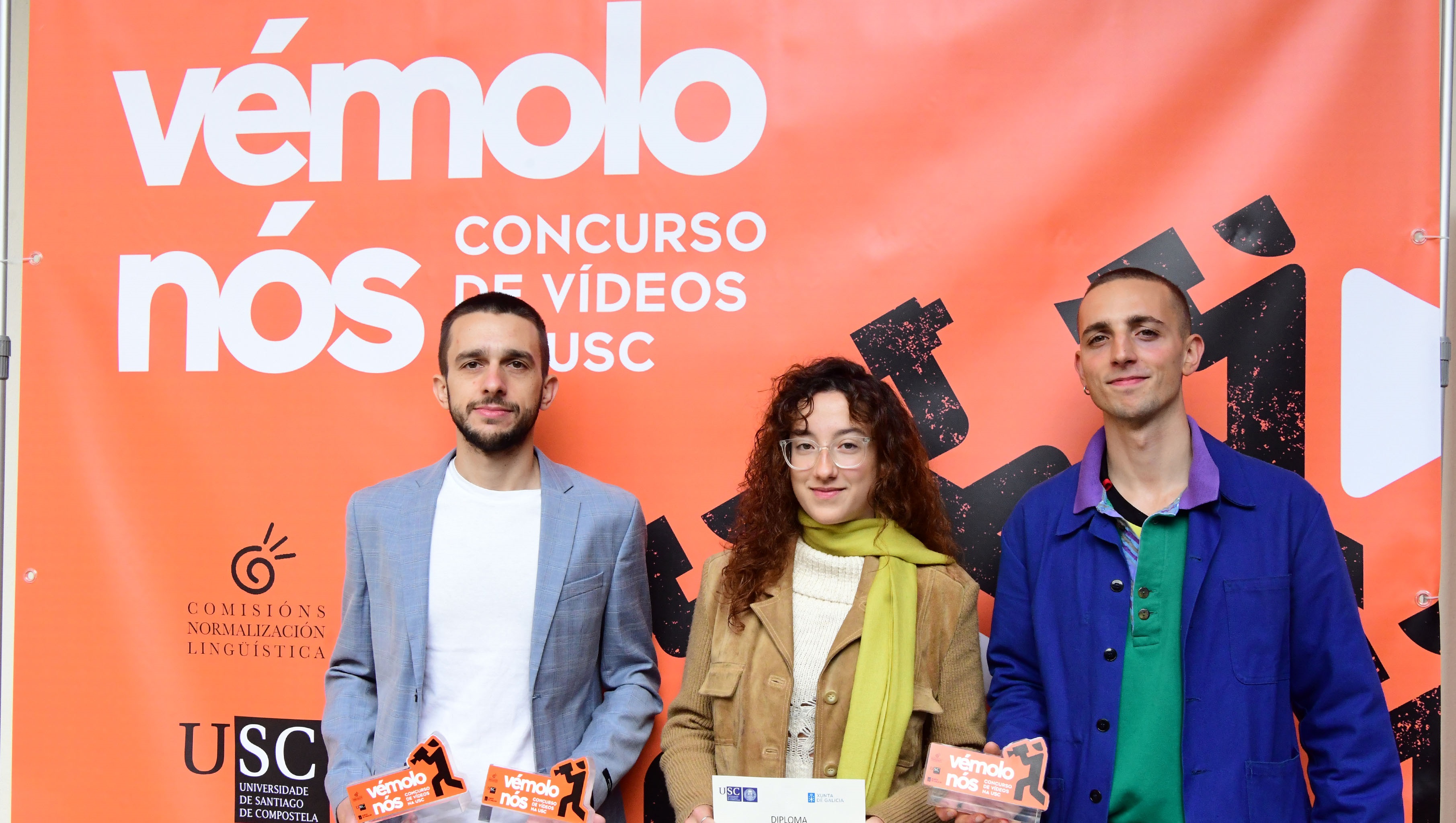 Alejandro Gómez Pazo, Paulo Miguel Mouriño Pereiro, Celia Eiras Rubín e Estrela Ocaña Abadín son as persoas gañadoras da primeira edición do certame ‘Vémolo nós’ co que o Servizo de Normalización Lingüística da USC busca promover a produción e a difusión de vídeos curtos e orixinais que fomenten o galego como lingua de divulgación científica. O acto de entrega dos galardóns desenvolveuse este venres 22 no claustro do Colexio de Fonseca e contou coa participación do vicerreitor de Transformación Dixital e Innovación, Gumersindo Feijoo Costa; o secretario xeral de Política Lingüística, Valentín García; e o director do Servizo de Normalización Lingüística da USC, Manuel Núñez Singala, quen deu paso á entrega de premios.