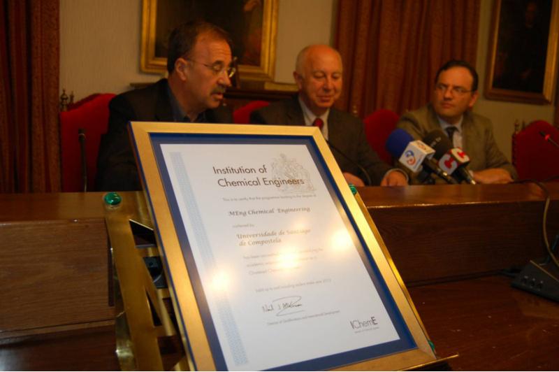 A institución de Enxeñeiros Químicos (IChemE), organismo fundado en 1922 con base no Reino Unido, acaba de acreditar na modalidade de máster (MEng) ao grao de Enxeñaría Química da Universidade de Santiago. Deste xeito, os estudantes que rematen o seus estudos pola USC poderán optar á categoría de Chartered Engineer, título profesional que avala a calidade da preparación dos enxeñeiros. O grao compostelán é o segundo de toda España que alcanza esta recoñecemento profesional e académico, por detrás de Valladolid. Esta acreditación presentárona en rolda de prensa o reitor da USC Juan Casares, o director da Escola Técnica Superior de Enxeñaría, Juan Lema, e o director do Departamento de Enxeñaría Química, Gumersindo Feijoo Costa. O Institution of Chemical Engineers (IChemE) agrupa a preto de 30.000 enxeñeiros químicos de 113 países. Está considerada, xunto con ABET de Estados Unidos, como unha das institucións de maior prestixio, tendo acreditado o BSC ou o Máster en Enxeñaría Química en máis de 60 universidades arredor do mundo. O proceso de acreditación profesional comezou en maio de 2010 cos traballos da comisión que elaborou a documentación. Xa en outubro tivo lugar a visita da comisión de avaliación, que integraban dous representantes universitarios e outro do mundo empresarial. A comisión mantivo diversas xuntanzas con profesores e alumnos ademais de realizar un recoñecemento das instalacións. Finalmente, na súa sesión plenaria do mes de decembro IChemeE acordou a validación que deberá agora revalidarse no ano 2013. Na súa avaliación, o Comité destacou as fortalezas do título e salientou as innovacións (algunhas delas incorporadas ao catálogo de ‘mellores prácticas’ do organismo avaliador), como as excelentes relacións coa industria e a investigación de calidade que se ven reflectidas na docencia, a realización do Asessment center (avaliación de capacidades profesionais), o ensino en inglés, o fomento da docencia por medio dos ‘Premios Leonardo’ e, especialmente, o entusiasmo mostrado por profesores e alumnos. Enxeñaría Química na USC Segundo indicou Juan Lema na presentación da acreditación, o grao en Enxeñaría Química posúe unha máis que destacada demanda, con 337 solicitudes para un total de 60 prazas e unha nota de acceso de 8,19 para os alumnos procedentes do Bacharelato. A maior porcentaxe de matriculados procede da provincia da Coruña (44%) e Pontevedra (36%), seguidas de Ourense (8%) e Lugo (6,5%), así como un 4,5 por cento de alumnos procedentes de fóra da comunidade. No ranking ’50 carreras’ das titulacións máis demandadas en España, Enxeñaría Química da USC figurou por cinco anos consecutivos entre as cinco mellores da especialidade. De feito, seis de cada dez dos seus titulados conseguen un traballo afín cos estudos cursados antes dos tres meses. Segundo datos do centro, os seus graduados acadan salarios nun 10 por cento superiores ao do resto de enxeñeiros e nun 20 por cento ao dos restantes titulados universitarios. No eido da investigación o grao compostelán atópase no sexto posto de todo o país atendendo ao volume de publicacións, segundo o Grupo Scimago e publicado en Universia, e rexistrando un factor de impacto que alcanza o segundo posto de toda España por detrás da Complutense de Madrid. Ademais, no seu proceso de adaptación ao Espazo Europeo de Educación Superior, o grao de Enxeñaría Química foi dos primeiros da Universidades compostelá en impartir clases en inglés, na actualidade un total de nove materias. Segundo Gumersindo Feijoo, a acreditación non só dará lugar a mellores oportunidades de emprego para os estudantes senón que tamén permitirá que o Departamento estableza vínculos internacionais, favorecendo o intercambio de estudantes con universidades doutros países. De esquerda a dereita: O director da Escola Técnica Superior de Enxeñaría, Juan Lema, o reitor da USC, Juan Casares, e o o director do Departamento de Enxeñaría Química, Gumersindo Feijoo
