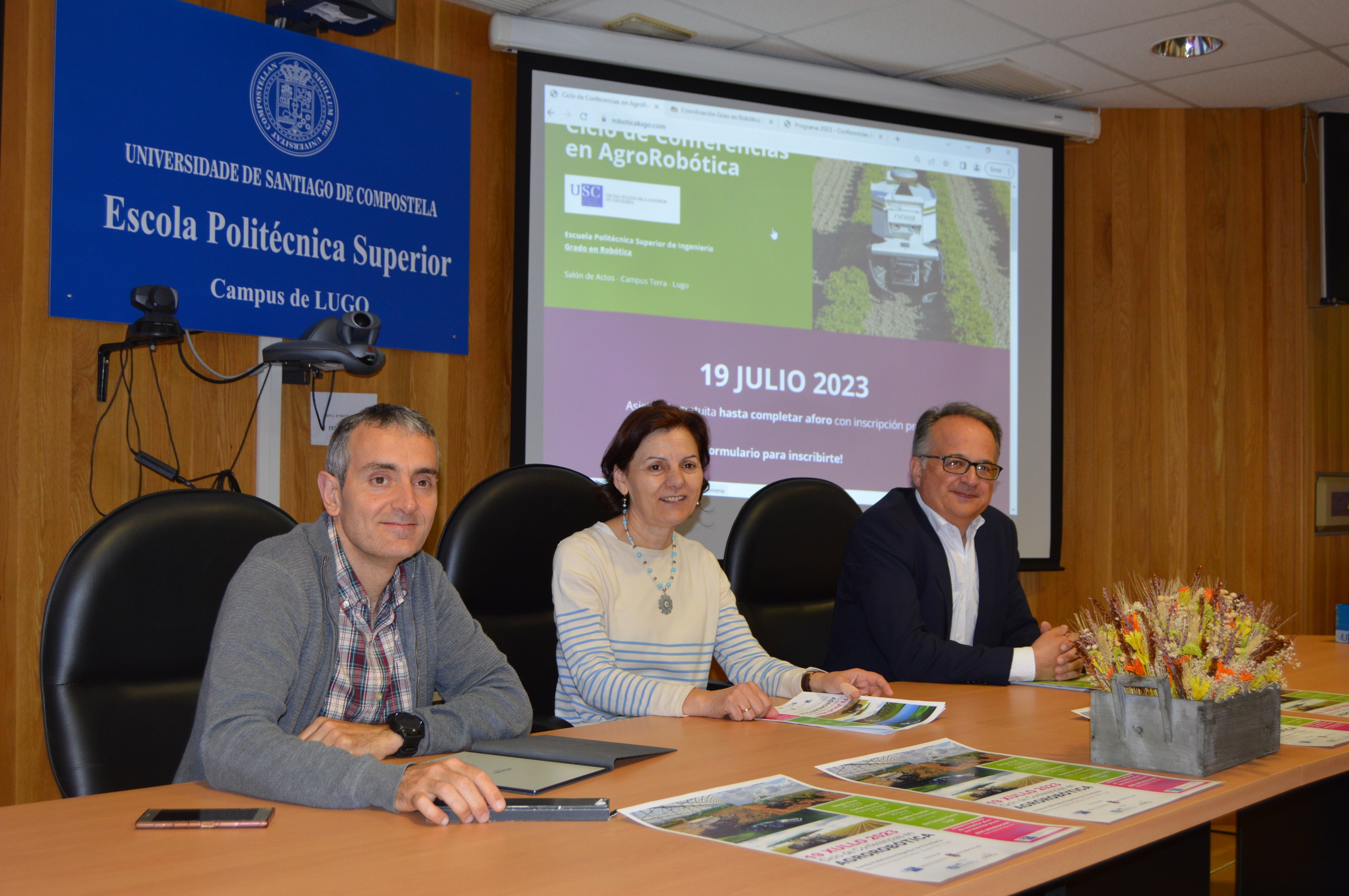 Roberto Iglesias, Rosa Romero e Javier Bueno, na presentación do ciclo sobre AgroRobótica