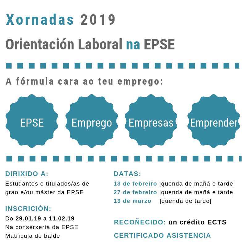 O primeiro dos tres bloques nos que se estruturan as xornadas ‘A fórmula cara o teu emprego: os catro ‘E’ (EPS de Enxeñaría, Emprender, Emprego, Empresas’ xirará arredor das competencias que se precisan para a busca activa de emprego. A presentación da oferta formativa de posgao da USC máis acaída para os intereses do alumnado da EPSE completará os contidos desta primeira sesión.