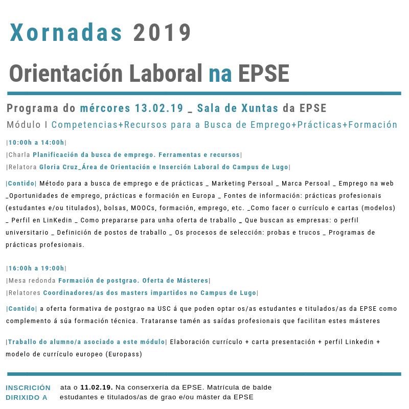A Escola Politécnica Superior de Enxeñaría do campus de Lugo da USC favorece a busca activa de emprego de estudantes e titulados coa organización da xornada de orientación en inserción laboral ‘ A fórmula cara o teu emprego: os catro ‘E’ (EPS de Enxeñaría, Emprender, Emprego, Empresas’. O programa, estruturado en 26 horas de formación distribuídas en tres xornadas, comeza este mércores, a partir das 10.00 horas, na sala de xuntas da EPS de Enxeñaría do campus de Lugo, cunha sesión en quenda de mañá e tarde durante a que se tratará de achegar ao público participante competencias transversais e ferramentas precisas tanto para a busca de emprego como para desenvolver iniciativas de emprendemento.