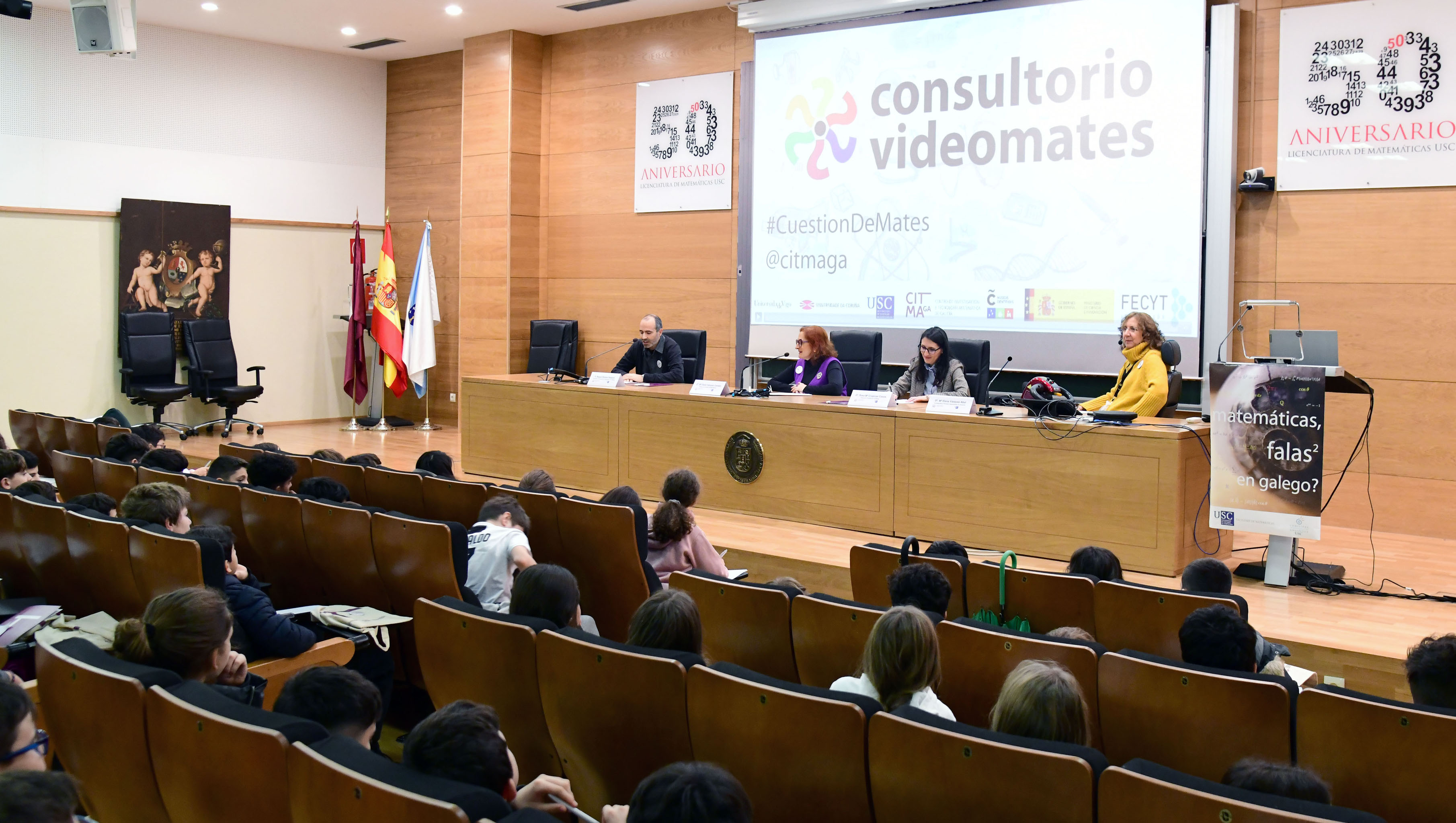 O Centro de Investigación e Tecnoloxía Matemática de Galicia (CITMAga), consorcio público das tres universidades galegas, botou a andar este xoves 30 de novembro o seu Consultorio VídeoMatemático, ao que o estudantado poderá enviar vídeos con cuestións matemáticas que responderán expertas e expertos da entidade. A presentación tivo lugar na Aula Magna da Facultade de Matemáticas compostelá, coa charla de divulgación titulada 'Números máxicos!' a cargo da profesora Elena Vázquez Abal.