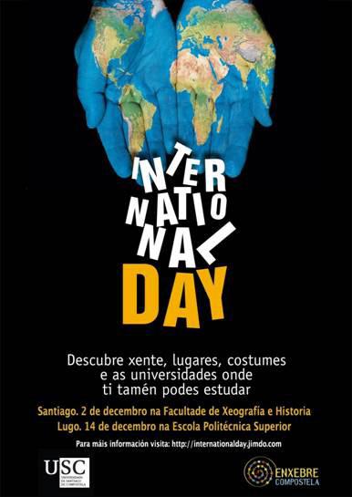 Os estudantes estranxeiros no Campus de Santiago serán estes xoves, 2 de decembro, os protagonistas do International Day que se celebrará nun ambiente distendido e festivo na Facultade de Xeografía e Historia co fin de achegar as súas universidades e culturas á comunidade da USC. Esta xornada, organizada en colaboración coa Asociación Enxebre Compostela, celebrarase o vindeiro día 14 en Lugo. Nesta segunda convocatoria do International Day está confirmada a presenza de estudantes de Italia, Polonia, Inglaterra, Rusia, Xeorxia, México, Perú, Chile, Arxentina, Nicaragua, Bolivia, Venezuela, Turquía, Uzbekistán, Kazajistán e Tajikistán. Os estudantes deses lugares presentarán os seus países de orixe, con referencias á xeografía, historia, gastronomía e mesmo á vida estudantil en diferentes postos e presentacións preparadas por eles mesmos. A inauguración terá lugar ás 11:30 horas no claustro da planta baixa da Facultade nun acto que preside o reitor, Juan Casares Long. A continuación, e ata a hora do almorzo (con pratos típicos elaborados polos estudantes), terá lugar a primeira serie de presentacións, que se repetirá pola tarde. A xornada rematará no Café Concerto Retablo (Rúa Nova, 13), ás 22:00 horas, coa entrega de premios aos mellores stands e presentacións. Coa celebración desta xornada preténdese que os estudantes, docentes e persoal da USC coñezan de primeira man outros países, así como as oportunidades de estudo e traballo que ofrecen a través do contacto directo e o intercambio de experiencias cos alumnos estranxeiros.