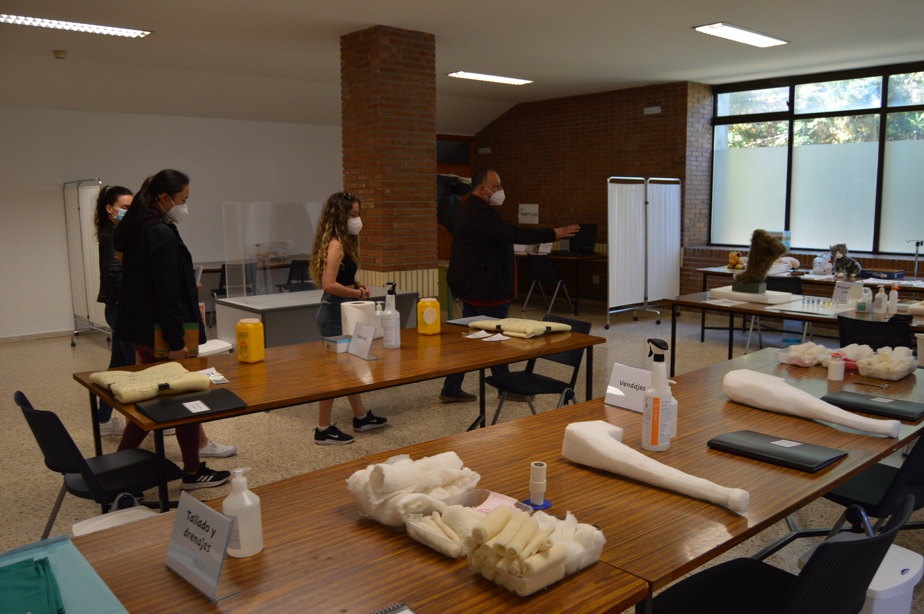 Luis Quintela, con catro alumnas preuniversitarias, no laboratorio de habilidades clínicas veterinarias