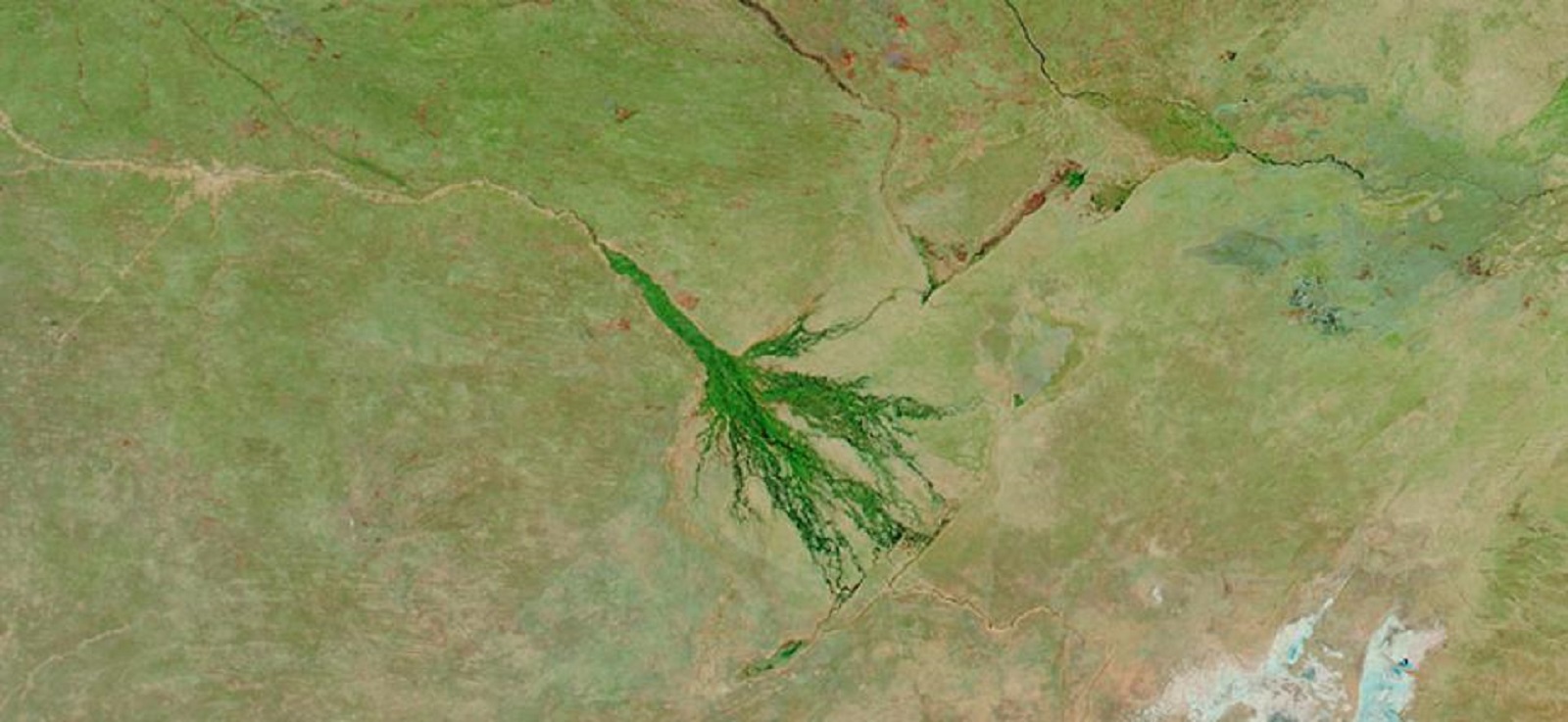 Imaxe de satélite do delta do Okavango no deserto de Botswana