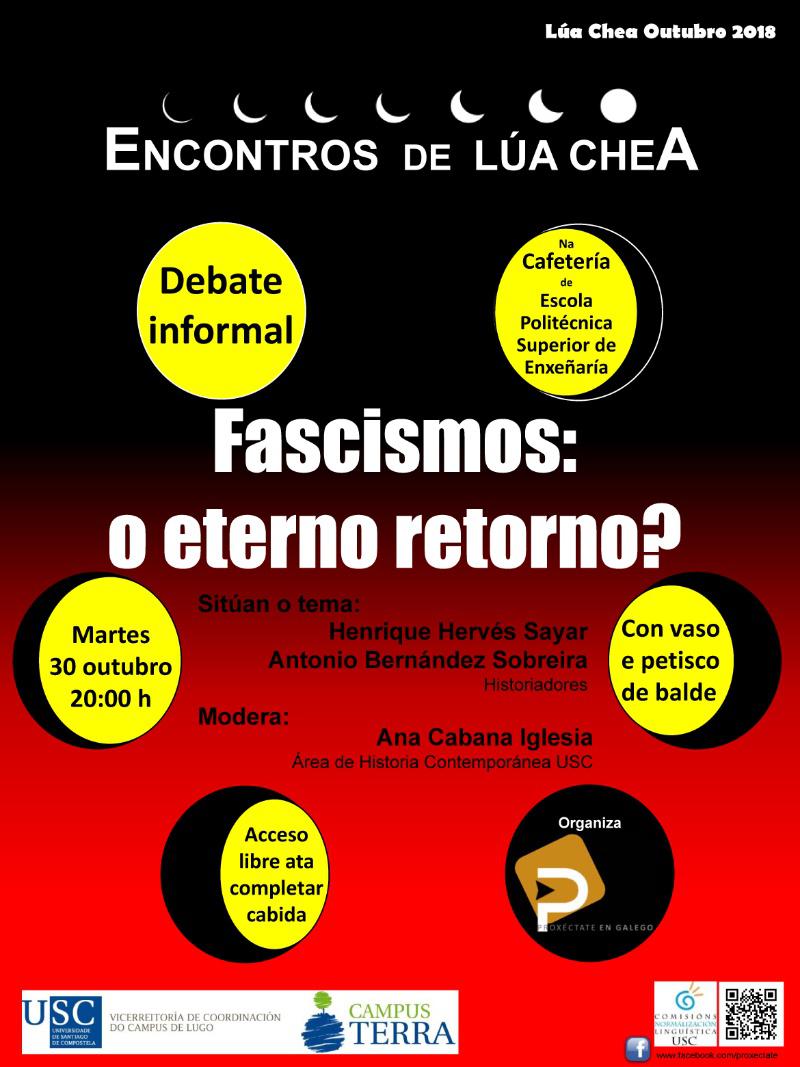 Os Encontros de Lúa Chea, un programa de encontros informais organizados polo colectivo Proxéctate en Galego para divulgar contidos académicos transversais de interese xeral ou de actualidade universitaria, tratarán este martes 30 de outubro de 2018, na cafetería da Escola Politécnica Superior de Enxeñaría do campus de Lugo, a temática dos fascismo.
