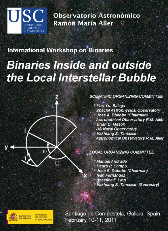 O ‘International Workshop Binaries Inside and Outide the Local Interstellar Bubble’ reúne este xoves 10 e o venres 11 na Facultade de Matemáticas a especialistas de Estados Unidos, Rusia, Francia, Italia, Armenia e España. O evento é o terceiro destas características organizado polo Observatorio Astronómico Ramón María Aller da USC, centro especializado neste eido dende que o propio Ramón María Aller introducira o estudo das binarias en España. O principal atractivo das estrelas dobres reside en que a partir das súas órbitas é posible calcular a masa das estrelas, sendo este un parámetro esencial para a evolución estelar. En Astronomía, as binarias resultan de grande interese por motivos diversos, sinalan os promotores do encontro, entre outros porque a súa dinámica “é un magnífico escaparate onde poden quedar reflectidos distintos fenómenos físicos de relevancia como perda de masa, influencia dos flares ou forma dos compoñentes". Ademais e como sinalan os expertos, nelas é posible detectar subcompoñentes e exoplanetas. O Observatorio da USC edita desde 1993 a Circular de Información da Comisión de Estrelas Dobres da Unión Astronómica Internacional, ademais de dispoñer dun catálogo de órbitas en liña. O director do Observatorio, o profesor José Ángel Docobo, é na actualidade presidente desta Comisión, e o tamén investigador do Observatorio compostelán Vakhtang Tamazian membro do Comité de Organización. Ademais deles integran o equipo de investigación do Observatorio Josefina Ling, Manuel Andrade, Iván Fernández, e Pedro Pablo Campo.