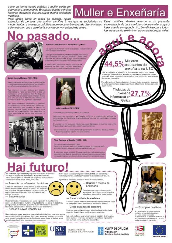 Dende este luns e ata finais do mes de outubro estará exposta na Escola Técnica Superior de Enxeñaría a exposición ‘O papel da muller na enxeñaría’. A mostra recolle os pósteres elaborados para a exposición ‘MIT: Mujeres en la Informática y la Telecomunicación’ da Universidade de Granada, ademais do gañador do I Concurso de Pósteres que convocou a ETSE no mes de maio e que gañou o estudante Óscar Pardo Planas. Trátase de carteis biográficos dedicados a diversas científicas e tecnólogas destacadas na área das Tecnoloxías da Información e Telecomunicación con material gráfico e as súas achegas científicas máis relevantes. Entre as mulleres representadas na mostra figura Frances Allen, que hai dous anos visitou a USC no marco de ConCiencia, ou Mitchel Baker, promotora de Mozilla -coordinadora do famoso navegador Firefox ou do xestor de correo-e Thunderbird- e do software de fontes abertas.