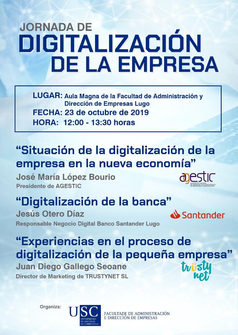 A Facultade de Administración e Dirección de Empresas do Campus de Lugo celebrará este mércores 23 de outubro, a partir das 12.00 horas, na Aula Magna do centro universitario, unha xornada sobre a situación e os procesos de dixitalización nas empresas.