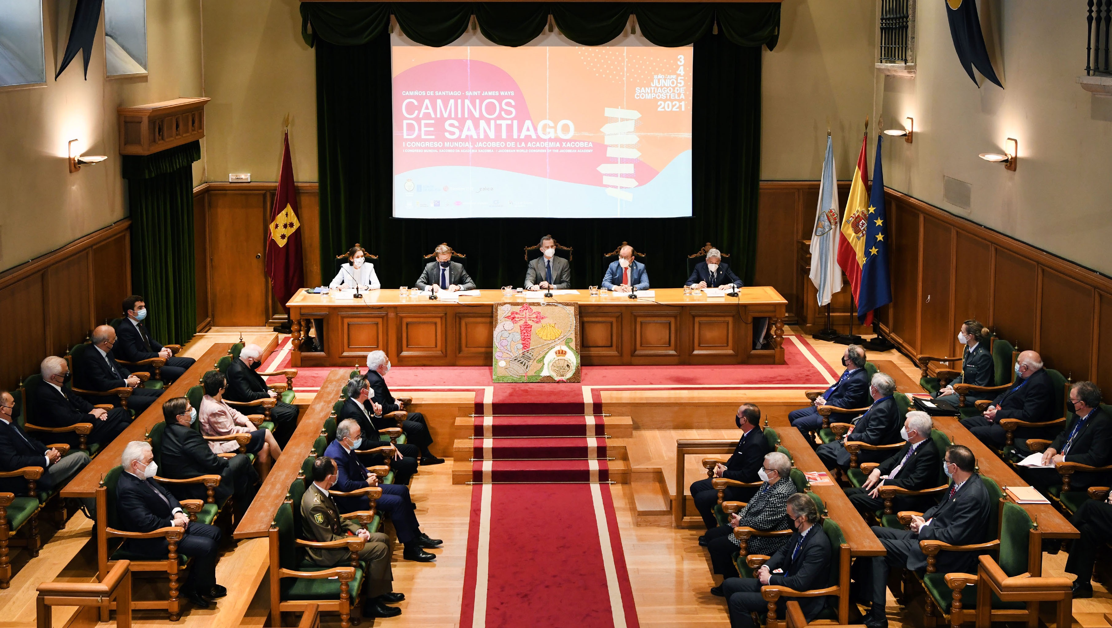No acto inaugural, alén do xefe do Estado e do reitor, tomaron parte a ministra de Industria, Comercio e Turismo, Reyes Maroto; o presidente da Xunta de Galicia, Alberto Núñez Feijóo; e o presidente da Academia Xacobea, Xesús Palmou.