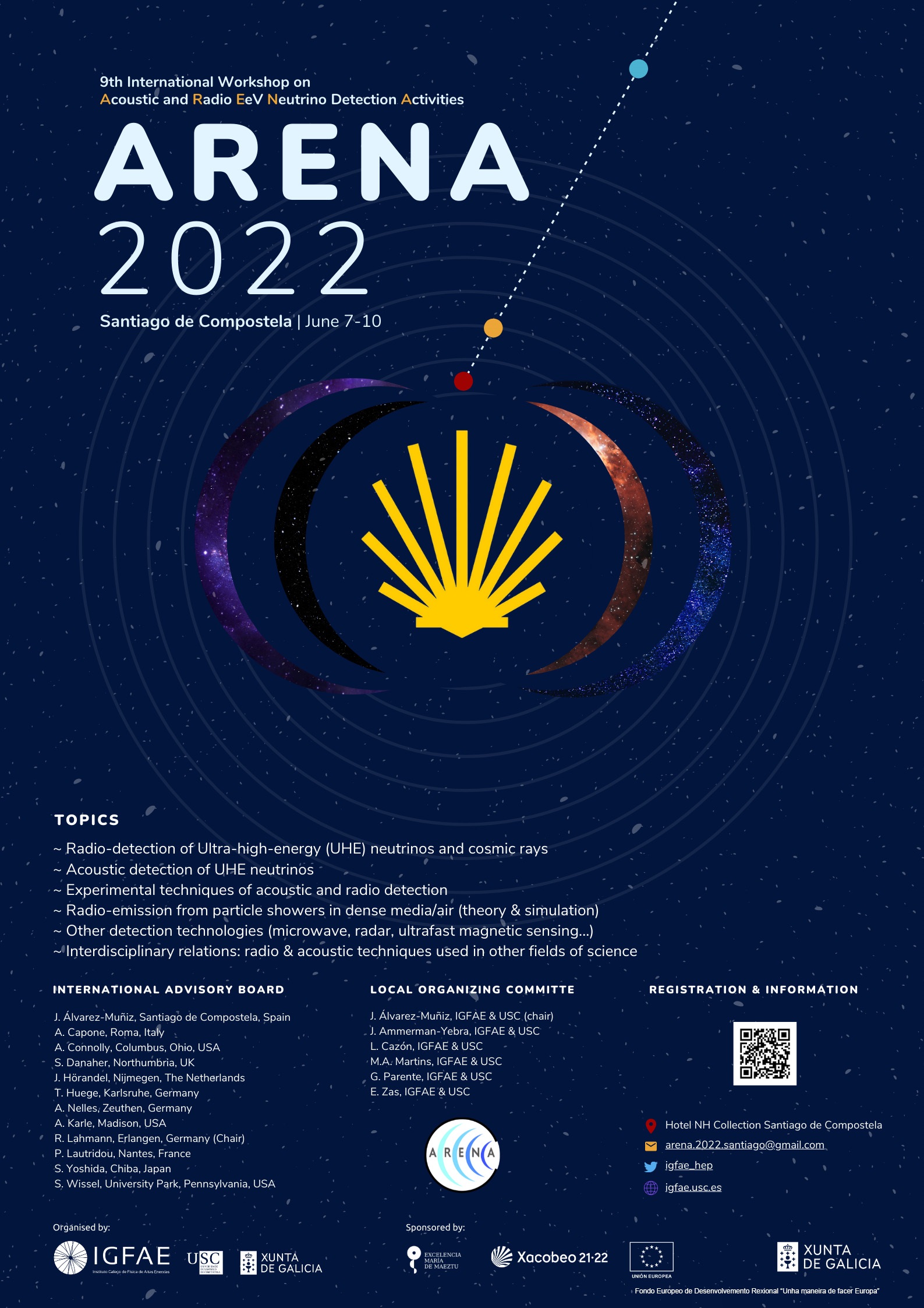 Do 7 ao 10 de xuño en Santiago de Compostela terá lugar o 9th International Workshop on Acoustic and Radio EeV Neutrino Detection Activities (ARENA 2022), o principal congreso bianual dedicado ao estudo e detección dos fenómenos máis extremos do universo, ao que acudirán ao redor de 70 especialistas de todo o mundo. Organizado polo Instituto Galego de Física de Altas Enerxías (IGFAE) da USC e a Xunta de Galicia, o encontro divide o seu programa científico en varios workshops que abordarán as diferentes técnicas e detectores para observar neutrinos e raios cósmicos de ultra alta enerxía, e os desafíos que expón a astronomía multimensaxeiro.