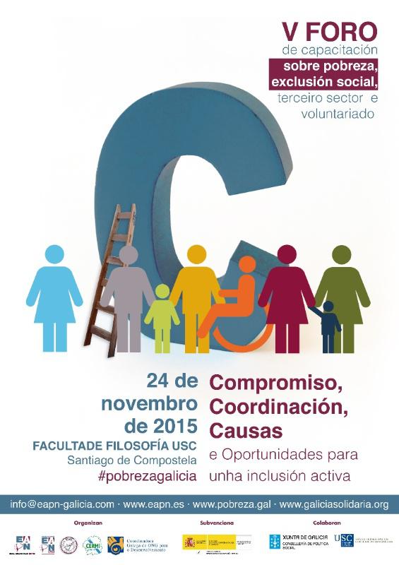 O V Foro de Capacitación sobre pobreza, exclusión social, terceiro sector e voluntariado, cita de referencia en Galicia para a análise das situacións de pobreza e exclusión e a proposta de solución, terá lugar este martes 24 na Facultade de Filosofía organizado pola Rede Galega contra a Pobreza e a Exclusión Social (EAPN Galicia) xunto á Coordinadora Galega ONGD e o Comité de Entidades Representantes de Persoas con Discapacidade (CERMI Galicia).