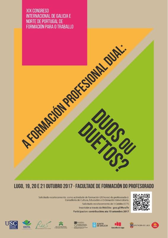 Co título ‘ Formación Profesional Dual: Dúos ou duetos?’, este congreso pretende facer visible e poñer en valor a realidade conceptual, normativa e práctica dos contextos da Formación Profesional Dual en Galicia e Portugal, ademais de debater acerca das relacións permanentes e/ou ocasionais da escola e a empresa, do intercambio dos saberes, da súa construción conxunta de coñecemento, da implicación das dúas na preparación das persoas para o desempeño das actividade produtivas recoñecidas como traballo e do impacto no mercado laboral e na sociedade.