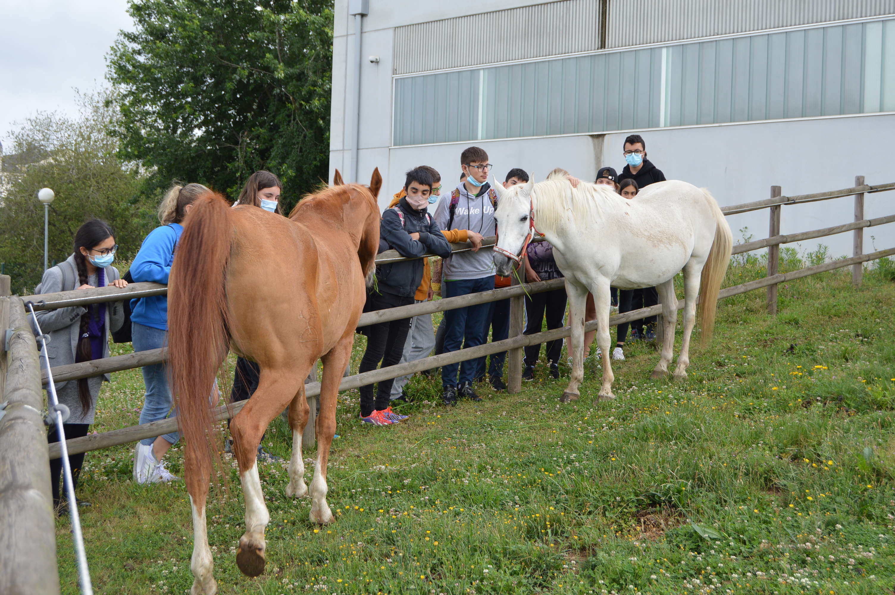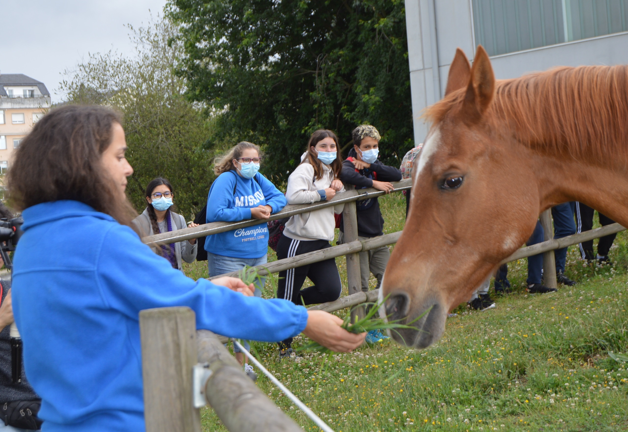 Usuarios do programa 'Vincúlate' acariñan égoas nas instalacións da Fundación Rof Codina