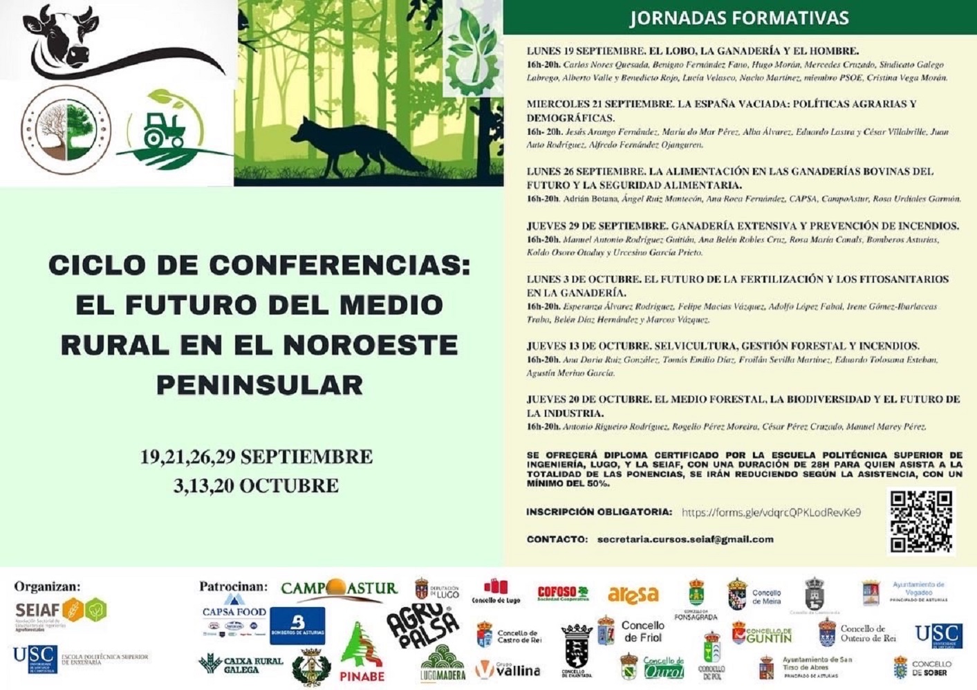 As xornadas, promovidas pola Asociación Sectorial de Estudantes de Enxeñarías Agroforestais están estruturadas en sete relatorios que se desenvolverán no Campus de Lugo os días 19, 21, 26 e 29 de setembro e 3, 13 e 20 de outubro. As persoas interesadas poden formalizar xa a súa inscrición en liña