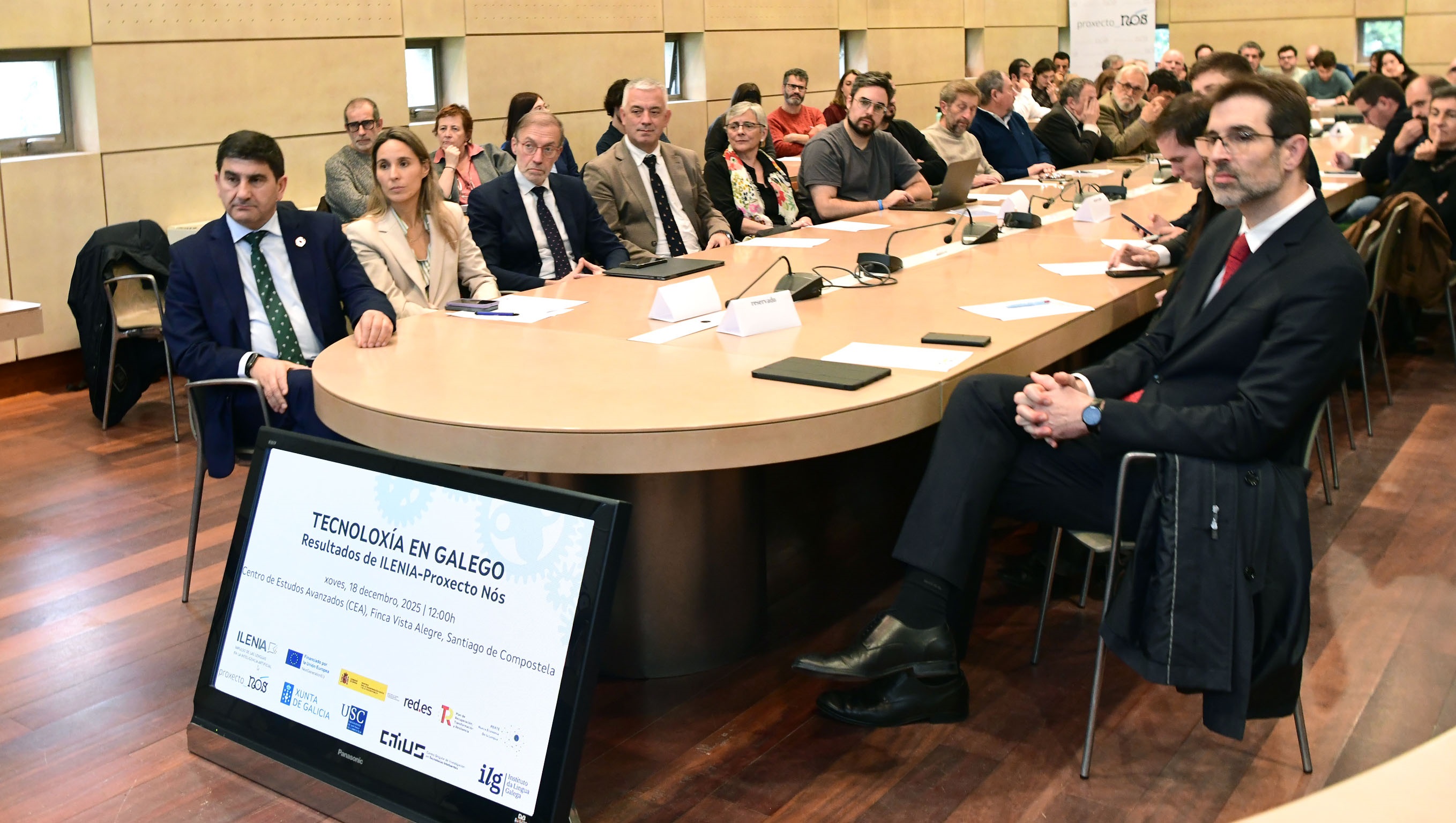 O encontro ‘Tecnoloxía en galego: resultados de ILENIA– Proxecto Nós’ serviu este xoves 18 para dar a coñecer os resultados dos últimos tres anos de traballo do Proxecto Nós no marco de ILENIA, unha iniciativa do Goberno de España orientada a avanzar en recursos e capacidades en tecnoloxías lingüísticas, en particular para as linguas do Estado. Datos, casos de uso e ferramentas abertas de tradución automática, síntese de voz e modelos lingüísticos en galego déronse a coñecer neste foro que se desenvolveu no Centro de Estudos Avanzados e que foi clausurado pola vicerreitora de Política Científica da USC, Pilar Bermejo.